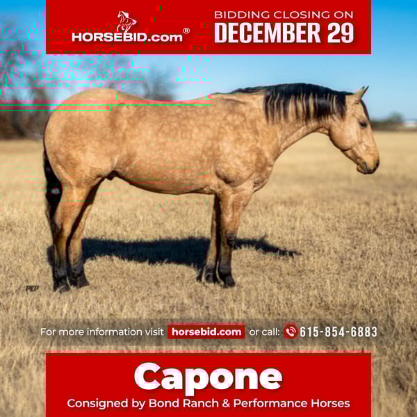 ⚜️ 𝓗𝓮𝓻𝓲𝓽𝓪𝓰𝓮 𝐖𝐢𝐧𝐭𝐞𝐫 𝓒𝓵𝓪𝓼𝓼𝓲𝓬⚜️ Happening now thru MONDAY | DECEMBER 29th - Available EXCLUSIVELY on HorseBid's website! For more details and to register visit: www.Horsebid.com CONSIGNOR CONTACT: Bond Ranch & Performance Horses 615-854-6883 LOCATION: Ranger, TX BREED: Quarter Horse REGISTERED: Yes REGISTERED NAME: HF THE BEAST COLOR: Buckskin HEIGHT: 14.2 AGE: 6 GENDER: Gelding HF THE BEAST "Capone" Bond Ranch & Performance Horses “Capone” is an eye-catching 14.2hh buckskin gelding with the kind of ability and mind that’s hard to find. This six-year-old gelding is by HF Mobster (NRHA $123,000+ earner and Million Dollar Sire), a son of Hall of Fame stallion Colonels Smoking Gun, with Hollywood Dun It influence on the top side. His bottom side adds proven cow sense and ranch-horse influence, blending elite reining bloodlines with real-world usability. Capone is exceptionally well trained in the arena with a smooth, fluid way of going. He glides around, floats at the trot, neck reins easily, stays soft in the bridle, and has correct, balanced lead departures. Not only is Capone a standout in the Western arena, he also excels under an English saddle. He moves beautifully through his gaits and is always up for some jumping fun. Bareback, bridleless, English, or Western—this gelding does it all. Capone has a big, endearing personality; he’s personable, easy to be around, and the kind that keeps you smiling without ever being pushy or silly under saddle. He is not a dead-head or a hot horse, but that ideal in-between with a confident, level-headed demeanor. Outside the arena, Capone is as dependable as they come. He is quiet with flags, whips, dragging logs, dogs underfoot, and heavy equipment such as tractors and skid steers. He travels well, sorts cattle willingly, has been used to gather and doctor, and stays broke even after time off. On the trail, he confidently navigates steep, rocky terrain and water crossings with ease. Cinch him up on a cold morning and head out—Capone brings no funny business and is ready to go to work. Whether it’s getting a job done on the ranch, turning heads in the show pen, or easing down the trails, Capone is guaranteed to be one you’re proud of. We are happy to answer any questions you may have about Capone. Please give Morgan a call at 615-854-6883 for additional information or to schedule a time to come meet him.