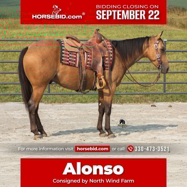 🍁𝒕𝒉𝒆 𝐅𝐀𝐋𝐋 𝑺𝒑𝒆𝒄𝒕𝒂𝒄𝒖𝒍𝒂𝒓🍁 Happening now thru MONDAY | SEPTEMBER 22nd - Available EXCLUSIVELY on HorseBid's website! For more details and to register visit: www.Horsebid.com CONSIGNOR CONTACT: North Wind Farm 330-473-3521 LOCATION: Fredericksburg, OH BREED: Quarter Horse REGISTERED: No COLOR: Buckskin HEIGHT: 14.3 AGE: 6 GENDER: Gelding Alonso is a 6 yr old buckskin quarter horse gelding standing at 14.3 hh. He is well trained to ride. He has an easy going personality and is very easy to get along with! He stands good for tacking up and for grooming! He enjoys getting bathes! Alonso is good in the pasture with other horses, he is turned out at night and comes in during the day. He is easy to catch in the field as well! Alonso has been on a trail ride with 500 other horses and has been part of a parade as well! He is used to the commotion and handles it well! He is the perfect step up horse for beginners or for kids! He is a great trail horse, he crosses creeks, steps over logs and watches him step going up and down the hills! He has been rode on the state route and doesn’t mind the traffic! He is used to being around dogs. He will go through all the obstacles. He doesn’t mind the tarp pr the ball! He walks over the bridge and the tires. He will also stand on top of the block! He stands good for mounting and waits to go until told! Alonso rides great in the arena, he will pick up both leads, he stops and backs up nicely! His walk, trot, canter is smooth and easy to sit to. He collects up nice but can also be rode on a lose rein! He rides bareback, western, and also bridles! He moves off of leg pressure, neck rein, and can also be rode using direct rein! He backs nicely through the poles and does a 360 in the box. He has a nice side pass too! He has been my go to mount for beginners to use on trail rides and in the parade! He is very gentle and quiet! Contact us for more info on Alonso or to meet him! He is 100% sound and healthy! North Wind Farm is renowned for its quality trail and all-around horses. Our horses are versatile and can excel in any discipline, making them perfect for riders of all levels. Whether you're looking for a reliable trail companion or a horse that can perform in various disciplines, North Wind Farm has the perfect match for you. Our commitment to excellence and passion for equine care ensures that each horse is well-trained, healthy, and ready to meet your needs. Contact us @ Tim (330) 600-8840 Lisa (330) 473-3521.