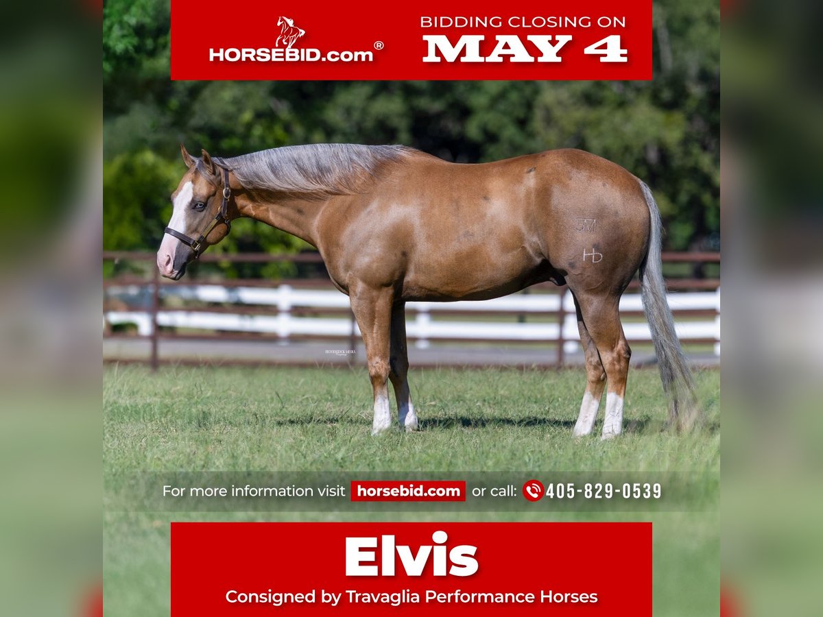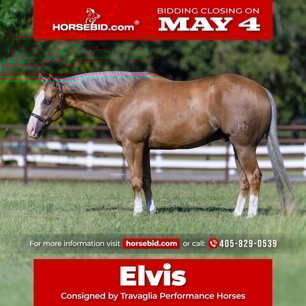 ▪️▫️◾️𝐭𝐡𝐞 𝑴𝒂𝒚 𝐒𝐞𝐥𝐞𝐜𝐭◾️▫️▪️ Happening now thru MONDAY | MAY 4th - Available EXCLUSIVELY on HorseBid's website! For more details and to register visit: www.Horsebid.com CONSIGNOR CONTACT: Travaglia Performance Horses 405-829-0539 LOCATION: Burleson TX BREED: AQHA REGISTERED: Yes REGISTERED NAME: Gunna Get Busy COLOR: Palomino HEIGHT: 15 AGE: 7 GENDER: Gelding If you’re searching for a gelding that can be used on your ranch or ridden down the trail one day and confidently step into the performance arena the next, meet elvis! A gorgeous, 7-year-old palomino gelding with a heart as big as his stop, Elvis has had great training his entire life, giving him a solid foundation built on consistency, trust, and care. He’s exceptionally personable, always willing, curious, and full of character. Elvis is a trained reining horse, ranch and rope horse you can head, and heel steers or ride him in the breakaway, He would make a great ranch rider. He has been around cattle and rode miles outside. Whatever you set your mind to he has had the miles and training to be right there with you! His jog, lope, and long trot are smooth, balanced, and comfortable, making every ride a joy. He has a huge, confident stop, clean, easy turnarounds, and effortless lead departures. Whether it’s a simple ride around the ranch or a trail ride across varied terrain, or roping a calf or steer Elvis remains steady, responsive, and confident every step of the way. He’s been around cattle and navigates new situations or arenas with ease. On the ground, Elvis is just as easygoing. Polite, kind, and fun to be around, he has a personality that keeps you smiling—expressive, affectionate, and always eager for scratches or treats. He’s a gentleman in the stall, excellent in cross-ties, loads and hauls without issue. Elvis is sound, well-built, and just all around dependable. He’s a horse you can ride every day—or give a week or two off and jump back on, confident that he’ll be exactly the same. With smooth, balanced gaits, a willing attitude, and a big personality, Elvis is versatile, consistent, and ready to become your next lifelong partner. Pedigree-wise, Elvis is sired by Busy Winin Chex, Sire of World Champions and Congress Champions and the earner of over $61,744 & 1209 AQHA points. His dam, Gunalicious is an own daughter of “Gunner” Colonels Smoking Gun, giving Elvis both the talent and mind that riders look for. Elvis is up to date on vaccinations, has clean X-rays and is located in Burleson, Texas, we welcome anyone to come meet and try Elvis to see for themselves why we love him so much. If you’re looking for a horse with the heart, talent, and personality to be both a competitive partner, don’t let this one pass you by. We can help arrange hauling and have shipped horses all over the United States and even internationally! Don’t hesitate to call us with any questions!
