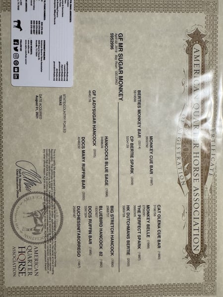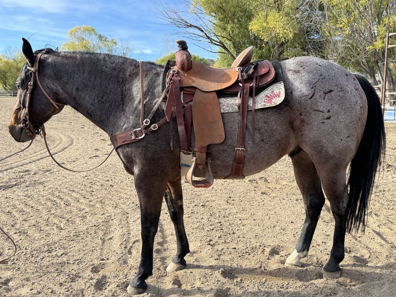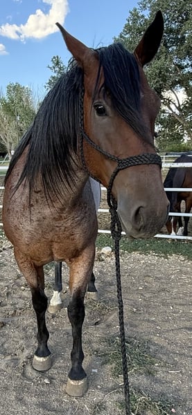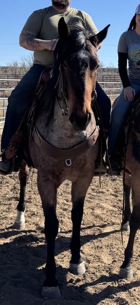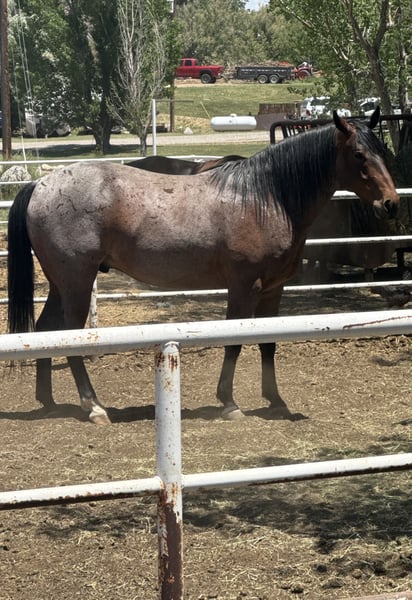 GF Mr. Sugar Monkey 2019 AQHA Bay Roan Gelding. 16.2hh top of wither. This horse is big bones and strong. He is handsome and big enough for any job. PPE Welcome at potential buyer's expense. UTD on vaccines and worming. Stands tied (no pulling back) Stands for shoer. Trailers like a dream! Current Coggins. He has a nice foundation on him; he has not been finished in any discipline. He has been used mainly for ranching, dragging cows, and roping. He has not worked a steer in about 6 months and has not been headed off for about two years. He hauls and rides out alone although, he prefers company. He has good ground manners, and the kids have ridden him. He has had one incident of bucking last year, and we are not sure why, as it is not typical for him. He needs a full-time job to be at his best or at least ridden weekly. This guy is beauty and brains. He can go in any direction and would make a great roping partner with finishing. He is best suited for an experienced rider.