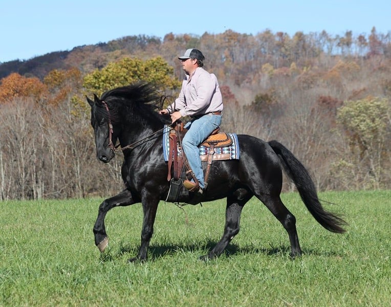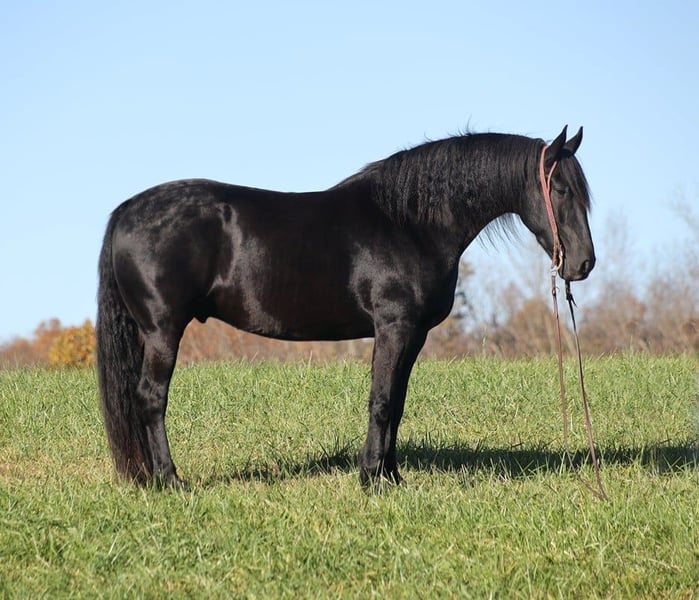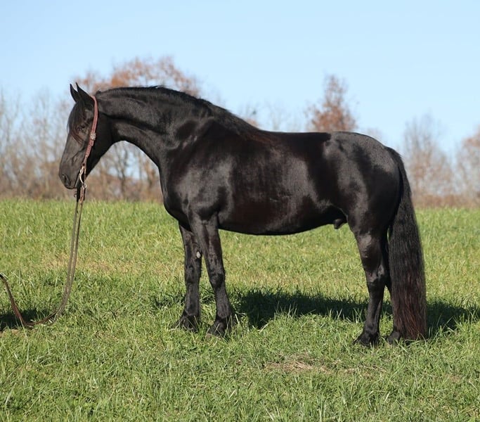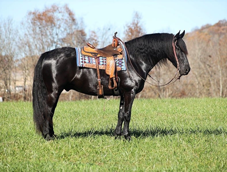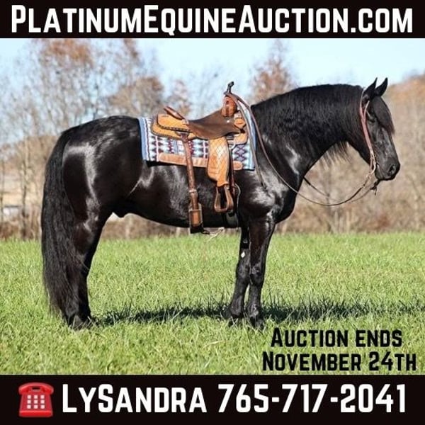 ONLINE AUCTION Place your bids at www.PlatinumEquineAuction.com Starting Bid $3500 Auction ends November 24th, 2024 Need a new saddle? Check out White Rock Saddles on our website or Facebook! Get you a big eye full of this hansom rascal!! Del Fuego is a 2019 model, 16-16.1h, jet black Friesian Sport Horse gelding that is built like a tank! Fuego is a FANCY looking and fancy moving dude!! He will go anywhere that you point him on the trails, whether that is steep slopes, over deadfall, across rivers or rough terrain, he handles it with ease! He has been ridden around cows. He has been desensitzed to tarps, balls and whips. Fuego lopes nice circles, has a good stop and backs. Fuego has also been driven under harness. Fuego requires no maintenance and stays sound even with hard work. For more info contact Lucky 13 Equine Lysandra 765-717-2041 or Matt 765-698-4655 Located in Brodhead, KY. ONLINE AUCTION Place your bids at www.PlatinumEquineAuction.com Starting Bid $3500 Auction ends November 24th, 2024 Need a new saddle? Check out White Rock Saddles on our website or Facebook!