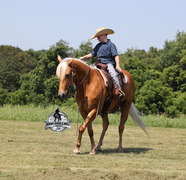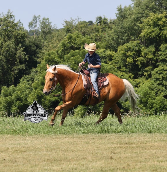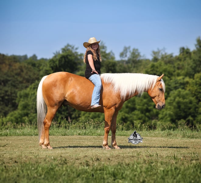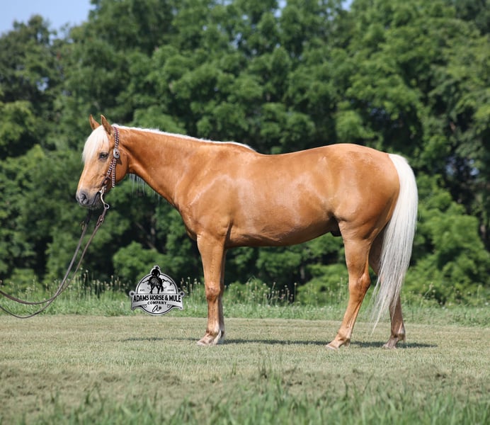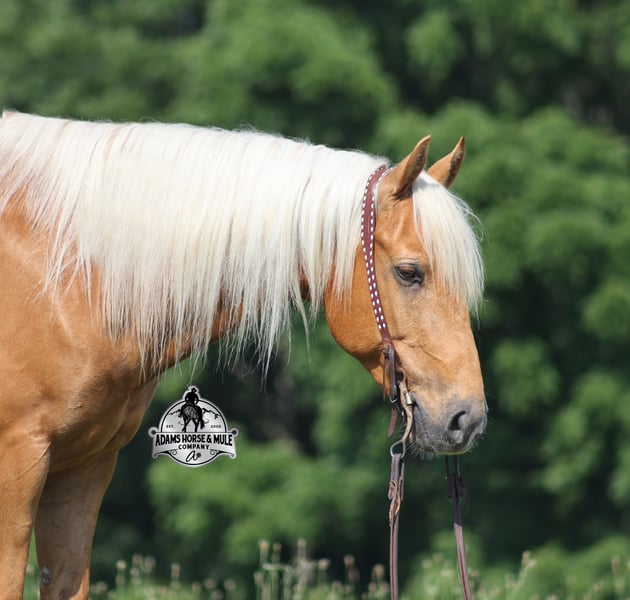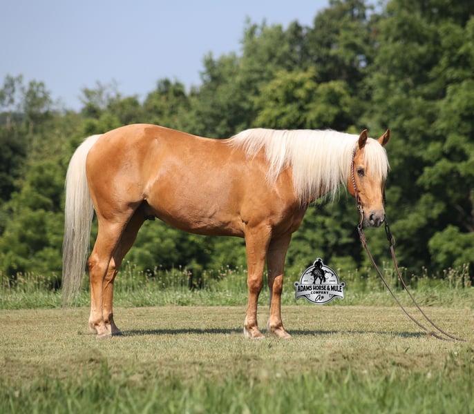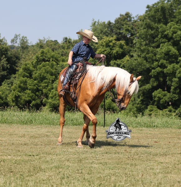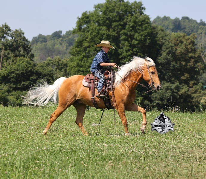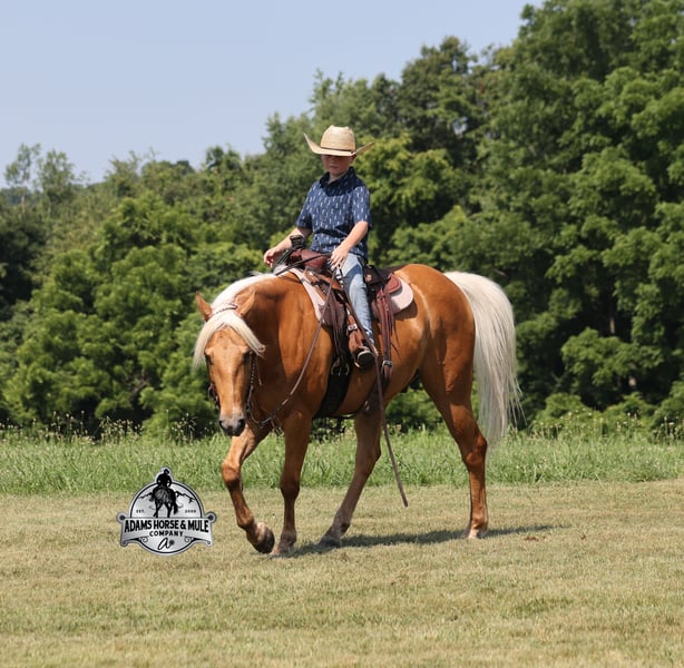 Fort Knox has not seen gold this shiny!!! Jacks Starlight Gold is a beautiful Golden Palomino Gelding that shines like a gold bar! He is well built, standing around 14.2hh and he is a 2018 Model Registered AQHA gelding! Starlight is a gentle type of horse that is not in a hurry! He lopes nice circles, even in a halter being ridden bareback, he catches the correct leads, has a good stop and reins around. Starlight has been ridden around the ranch, with the cows and through the trails and creeks by our 7 year old and he is for sure a horse that is going to take care of his rider! Starlight just eases along and loves going on trail rides. He will cross creeks, ditches, logs and navigate rough rocky areas. He has been exposed to all kinds of wildlife and will go anywhere that he is asked too. He has been ridden many miles in the mountains and encountered every obstacle possible on the trail. He will go up or down even the steepest slopes, across deep creeks, over downed trees, and over all types of rough terrain while still being sure footed. Starlight has been used around the ranch and is good around cows. If you need a broke, quiet, gentle, safe horse for ranch or trails and you do like things that are shiny and golden… Jacks Starlight Gold is your perfect horse! Call Eric 606-308-2461 with any questions. Go to visit our website for more pics and a video www.AdamsHorseAndMuleCo.com AHAMC has been in the horse business and sold horses over the internet since 2005. We have a long track record of success with hundreds of happy customers. We work hard to match riders with the correct horses and specialize in beginner safe, family friendly horses that have been used and checked out by our family! We can set up transportation anywhere in the US and look forward to working with you.
