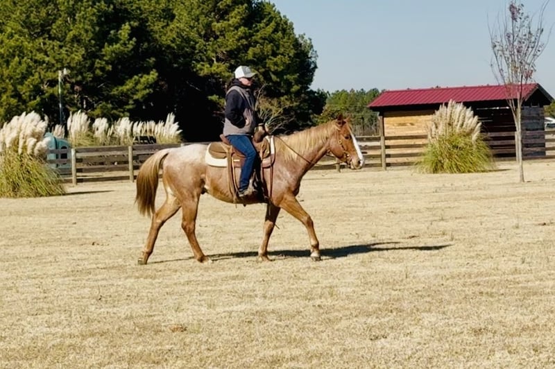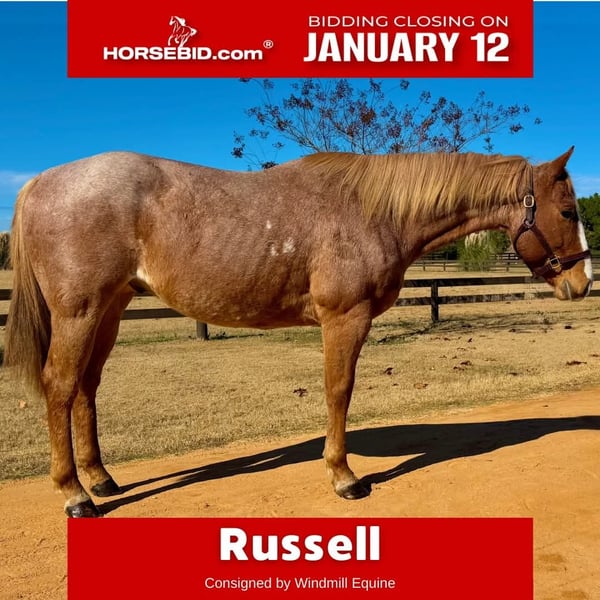 ♦️𝐍𝐄𝐖 𝐘𝐄𝐀𝐑'𝐒 𝑬𝒙𝒕𝒓𝒂𝒗𝒂𝒈𝒂𝒏𝒛𝒂♦️ Happening now thru MONDAY | JANUARY 12th - Available EXCLUSIVELY on HorseBid's website! For more details and to register visit: www.Horsebid.com CONSIGNOR CONTACT: Windmill Equine 860-250-9120 LOCATION: Johnston, SC BREED: QH REGISTERED: No COLOR: Red Roan HEIGHT: 15.2 AGE: 7 GENDER: Gelding Russell is a 7yo 15.2h QH gelding. This guy is so much fun. In the barn he is kind and easy. He is great in group turnout and is easy to catch. Under saddle this guy has a lot of miles in a variety of jobs but nothing overly formal. He rides English and Western, bareback too. He is light in the bridle with a good headset and an easy whoa. He has three comfortable and balanced gaits that are also very adjustable. He jumps a small course of fences and his changes have been started. Out of the ring this guy is brave, willing and honest. He has seen many miles through the trails, down the road and even up in the mountains. He is traffic and dog safe and will ride out alone or with company. He goes anywhere he is asked and will ride though the toughest terrain and go over, under or through anything. One of his favorite things is going trail blazing. He truly will go absolutely anywhere you point him. He has worked the ranch, seen the cows and had a rope thrown off of him. He is not phased by a busy day on the ranch. He has also gone out to track cows, catch strays and check fences. This guy is the type to be your absolute best friend in life. He aims to please and is really a smart boy. He loves having a job, but he loves his person more. He just wants to keep you happy. He is barefoot with no vices or maintenance. This guy is ready for his person, family or program. He is ready to be finished with one job or continue as a jack of all trades. No matter what, he will always be your best friend.