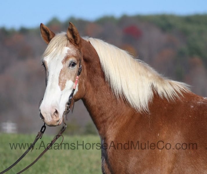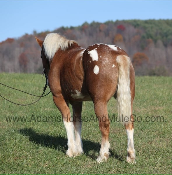 Patch is one of the most unique Draftcross geldings that have had the pleasure to own! He is a sorrel flax mane and tail blanketed Appaloosa that is weighing in around 1400lbs and stands aroujnd 16.2H! He is 6 years old and is very well built. Patch has been ridden around the ranch, checked cows and rode fences. He is a slow and laid back type of horse that will just ease along down the trails with no hesitation. He is a horse that the whole famliy will love and one that will help build everyone’s confidince levels! He has been camping in several states and has been ridden by all ages of beginners. When out on the ranch or going down the trails he will cross creeks, ditches, logs and navigate rough rocky areas. He is safe in traffic safe whether that be trucks or cars. He has a nice jog, his lope is slow, collected and very easy to set as he lopes nice circles! He has been exposed to all kinds of wildlife such as deer or turkey. If you are a big ol feller, a lil bitty lady or a combination of each… Patch will take care of you! Feel free to call Eric 606-308-2461 with any questions! Go to visit our website for more pics and a video www.AdamsHorseAndMuleCo.com AHAMC has been in the horse business and sold horses over the internet since 2005. We have a long track record of success with hundreds of happy customers. We work hard to match riders with the correct horses and specialize in beginner safe, family friendly horses that have been used and checked out by our family! We can set up transportation anywhere in the US and look forward to working with you.