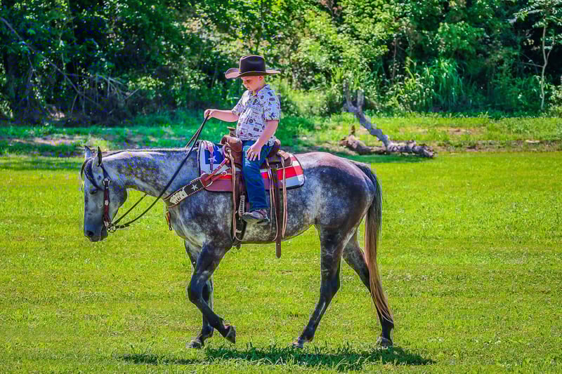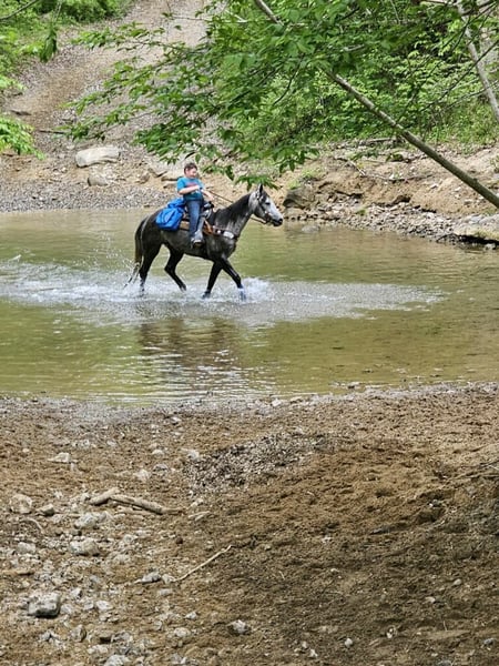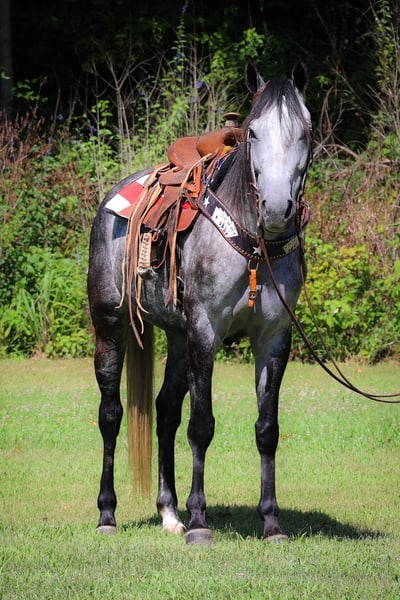 ONLINE AUCTION Place your bids at www.PlatinumEquineAuction.com Starting Bid $3500 Auction ends July 21st, 2024 Need a new saddle? Check out White Rock Saddles on our website or Facebook! This is Liz, a super nice, extremely gentle, and very well trained DAPPLE GRAY QUARTER HORSE MARE. She is 6 years old and has been youth ridden and youth shown. She has been used for ranch work, will pen and sort cattle, check cattle in the pasture, and move them from field to field. She has been hauled and shown at the open shows in English and Western classes by a 6 year old boy. She will trail ride low headed and relaxed, she crosses water with confidence, and she is fine with unsure footing. She is a great horse to have for any level rider to enjoy. She lopes nice circles, stops on whoa, backs up, and moves off of leg cues. This mare is safe and quiet for beginners yet will ride around when asked to do so. She is versatile, attractive, and the same every time you get her out to ride her. She has carried the flag and been in parades. She is traffic safe and not spooky. She is 15 hands tall and 6 years old. She is honest, true, well trained, and obedient. Located in Salt Lick, KY. Contact James May 606-336-2274 with any questions. ONLINE AUCTION Place your bids at www.PlatinumEquineAuction.com Starting Bid $3500 Auction ends July 21st, 2024 Need a new saddle? Check out White Rock Saddles on our website or Facebook!