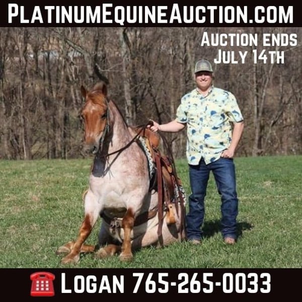 ONLINE AUCTION Place your bids at www.PlatinumEquineAuction.com Starting Bid $3500 Auction ends July 14th, 2024 Need a new saddle? Check out White Rock Saddles on our website or Facebook! Here is one that checks the boxes… well built, well broke, lots of color and friendly… Asher is a stout built Red Roan gelding standing around 15hh, he is 6 years old and is one the most kind and friendliest horses that you will find! Asher has done some of the natural horsemanship training and he also knows some tricks, he will bow, lay down and set on his rump. Asher has been ridden down the highways, we have had him in town and he is very traffic safe. Asher is great on trails and he will cross creeks, ditches, logs and navigate rough rocky areas. He has a smooth jog, a VERY VERY nice easy to set lope, a good stop, spins a circle both ways and backs with ease! He has been exposed to all kinds of wildlife such as deer or turkey or other animals like cows or dogs and will go anywhere that he is asked too. He has been rode many miles in the mountains of Eastern Kentucky and encountered every obstacle possible on the trail. He will go up or down even the steepest slopes, across deep creeks, over downed trees, and over all types of rough terrain while still being sure footed. Located in Level Green, KY. Feel free to call Moore Trained Horses Logan 765-265-0033 with any questions. ONLINE AUCTION Place your bids at www.PlatinumEquineAuction.com Starting Bid $3500 Auction ends July 14th, 2024 Need a new saddle? Check out White Rock Saddles on our website or Facebook!