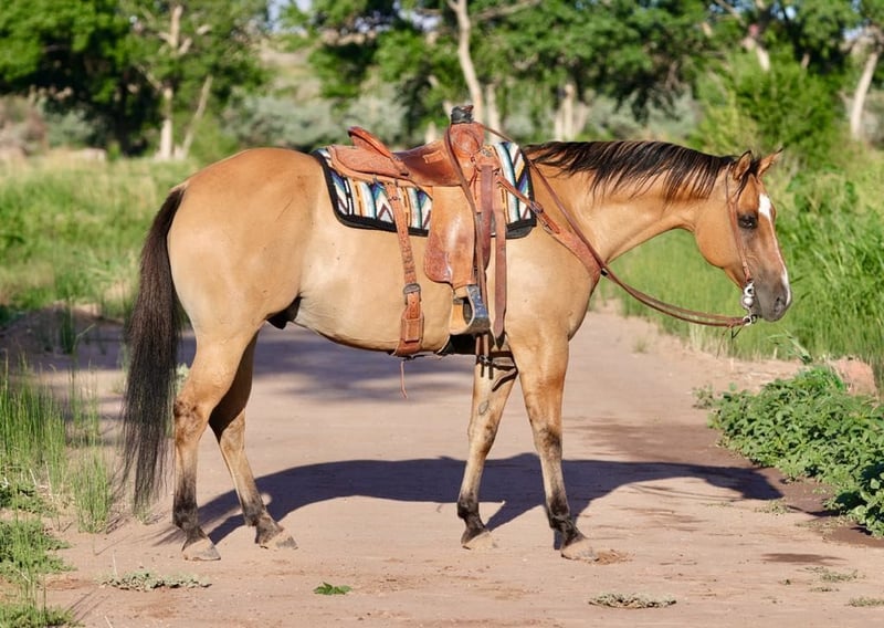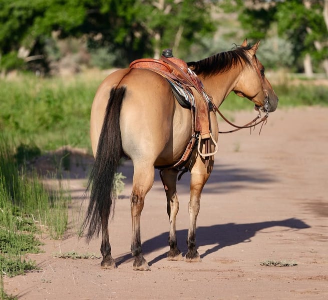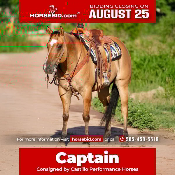 ⭐️ 𝐀𝐔𝐆𝐔𝐒𝐓 𝓐𝓵𝓵 𝓢𝓽𝓪𝓻 𝓛𝓲𝓷𝓮𝓾𝓹 ⭐️ Happening now thru MONDAY | AUGUST 25th - Available EXCLUSIVELY on HorseBid's website! For more details and to register visit: www.Horsebid.com CONSIGNOR CONTACT: Castillo Performance Horses 505-450-5519 LOCATION: Belen, NM BREED: Grade/Quarter Horse REGISTERED: No COLOR: Dun HEIGHT: 15.1 AGE: 8 GENDER: Gelding If your pickup needs 4-wheel drive, your horse probably does too—and that’s where Captain comes in. He’s an 8-year-old, cowboy-colored dun gelding: ranch-raised, mountain-tested, and built like a tank with 15.1 hands and 1200 lbs of bone, back, and good feet. Easy keeper. Stays sound. Doesn’t melt in the rain or spook at shadows. He’s going to saddle up the same every time. Same owner since he was a yearling, and Captain’s seen more backcountry than a game warden. He’s packed hunters, covered rough miles, and done honest ranch. Point him at a hill, a canyon, or a long day—he’ll take it on like it’s just another Tuesday. We’ve swung a rope on him and he took it like he’s been waiting his whole life for someone to hand him a job. He’s got the look, the mind, and the movement to make a head horse with a little more time. Travels out strong, and makes short work of a long day.