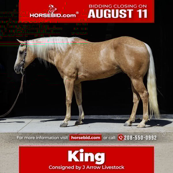 ⚜ The HERITAGE Classic ⚜ Happening now thru MONDAY | AUGUST 11th - Available EXCLUSIVELY on HorseBid's website! For more details and to register visit: www.Horsebid.com CONSIGNOR CONTACT: J Arrow Livestock 208-550-0992 LOCATION: Caldwell, ID BREED: Aqha REGISTERED: Yes REGISTERED NAME: Golden buckles COLOR: Palomino HEIGHT: 15.1 AGE: 8 GENDER: Gelding King is a big pretty athletic and extra fancy! Rides around like one should he's been through the reigning and cowhorse training. He will lope around really nice. He has beautiful leed departures and is very smooth! King will change leads and has very good speed control. King is bred to be a rope horse and he is gonna be an extra good one if that's the route you choose he's been started slow and correct. He's got lots of cow and will run one down. He doesn't get hot and seems to really like it. This is the kind we all love to ride. This gelding has a very bright future and would be an asset to any barn from the ranch classes to the Roping pen. King could go in many directions and should excell in anything he's directed towards.By Show me the buckles Eligible for the riata buckle, royal crown, and ruby buckle. Please give me a call fmi or to communicate try him 2085500992