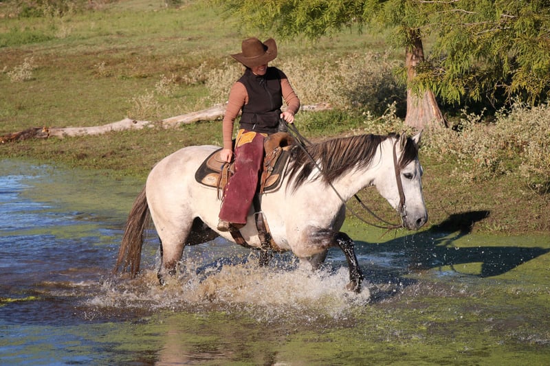 ♦️ The RIDER'S Choice ♦️ Jetzt bis MONTAG | 20. NOVEMBER - EXKLUSIV auf der HorseBid-Website verfügbar! Für weitere Details und zur Anmeldung besuchen Sie: www.HorseBid.com KONTAKT ZUM EINLIEFERER: Westbound Marketing 619-655-2272 STANDORT: Carthage, TX RASSE: QH EINGETRAGEN: Ja REGISTRIERTER NAME: Quick N Dun Right FARBE: Gray GRÖSSE: 15.2 ALTER: 5 GESCHLECHT: Wallach Wichita ist das Pferd, das dich jeden Morgen am Weidezaun begrüßt. Er ist sympathisch, freundlich und in der Tasche. Er ist daran gewöhnt, auf der Weide gehalten zu werden, und egal wie groß die Weide ist, er ist immer leicht einzufangen. Er wurde in erster Linie als Ranch- und Trailpferd eingesetzt, ist aber auch ein großartiges Hauptpferd, wenn Sie nach einem Pferd suchen, mit dem Sie in den Roping Pen gehen können. Wir sind auch der Meinung, dass er unter englischem Sattel großartig laufen würde! Er hat eine ausgedehnte, fließende Bewegung, die gut in die englische Disziplin übergehen würde. Seine Gänge sind entspannt und weich. Er ist kein schnelles Vorwärtspferd, aber er ist auch nicht super faul. Er ist eine angenehme Mischung aus beidem. Wichita ist sanftmütig, selbst in der Pause hat er nie gebockt. Er ist das, was wir als "old fashioned broke" bezeichnen. Er geht am Halszügel und reitet einhändig, wobei er zwischen den Trensenzügeln bleibt. Er geht an der Leine und dreht Kreise in beide Richtungen, geht zum Wenden über und hält sehr gut an, wenn man ihn darum bittet, ist aber nicht das, was wir als schick oder gehässig bezeichnen würden. Er ist ehrlich mit einfachen, benutzerfreundlichen Knöpfen. Wichita hat viel Erfahrung außerhalb des Reitplatzes und ist nicht leicht zu erschrecken. Er hat alle Arten von Wildtieren, Gelände und Wasserdurchquerungen gesehen, während er beim Zusammentreiben große Kreise ziehen musste. Wir haben mit ihm Rinder im Freien angeseilt, sowohl zum Verarzten als auch zum Verladen auf den Anhänger. Er läuft, wenn man ihn darum bittet, und geht genau dorthin, wo man ihn hinführt. Er zieht stark und kann gut mit einem Seil umgehen. Er war schon ein paar Mal in der Kopfbox und es wird nicht lange dauern, bis er auch als Kopfpferd gut läuft. Wichita ist sehr pflegeleicht. Er ist derzeit beschlagen, kann aber auch barfuß gehen, wenn Sie es wünschen. Er kommt in der Herde oder allein zurecht. Er hat keine besonderen Pflegeanforderungen. Er hatte noch nie größere Verletzungen oder Krankheiten und ist völlig gesund und fit. Seine Bodenmanieren sind wunderbar. Er lässt sich ruhig anbinden und anhängen und ist ein Gentleman beim Satteln und Zäumen. Wichita hat sein ganzes Leben und seine Karriere noch vor sich. Er wird ein lebenslanger Partner sein.