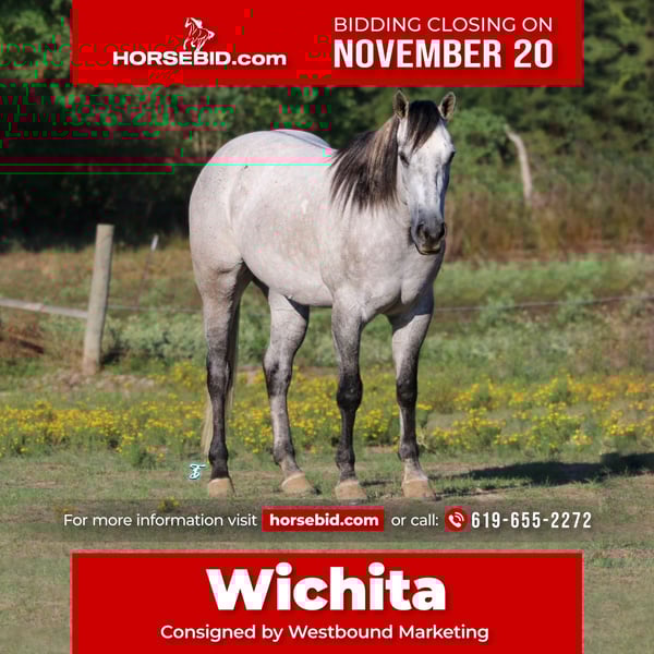 ♦️ The RIDER'S Choice ♦️ Happening now thru MONDAY | NOVEMBER 20th - Available EXCLUSIVELY on HorseBid's website! For more details and to register visit: www.HorseBid.com CONSIGNOR CONTACT: Westbound Marketing 619-655-2272 LOCATION: Carthage, TX BREED: QH REGISTERED: Yes REGISTERED NAME: Quick N Dun Right COLOR: Gray HEIGHT: 15.2 AGE: 5 GENDER: Gelding Wichita is the horse that meets you at the pasture gate every morning. He is personable, friendly and in your pocket. He is accustomed to being pasture kept and no matter how large the pasture he is always easy to catch. He has been utilized primarily as a ranch and trail horse but is a great head horse prospect if you’re looking for one to head to the roping pen with. We also feel he would go great under English tack! He has an extended floating movement that would transition well to the English discipline. His gaits are relaxed and smooth. He is not a forward quick footed horse but he is not super lazy either. He is a pleasurable medium between the two. Wichita stays gentle, even with time off he has never offered to buck. He is what we refer to as “old fashioned broke”. He neck reins and rides one handed staying right in between the bridle reins. He catches his leads and lopes circles both ways, will cross over to turn around and stop very well when asked, but is not what we would call fancy or catty. He is honest with simple, user friendly buttons. Wichita has a lot of experience outside of the arena and is not easily spooked. He has seen all kinds of wildlife, terrain and water crossings while being used to make large circles during gathering. We have roped cattle on the outside with him both to doctor and to load on the trailer. He has run when you ask for it and will track in right where your hand points him. He pulls strong and handles a rope well. He has been in the head box a couple times and it will not take long to have him going good as a head horse. Wichita is an easy keeper. He is currently shod, but can go barefoot as well if you wish. Gets along in a herd or by himself. He has no maintenance needs or special care requirements. He has never had any major injuries or sickness and is completely clean legged and sound. His ground manners are wonderful. He ties and trailers quietly and is a gentleman to saddle and bridle. Wichita has his whole life and career ahead of him. He will be a lifelong partner.