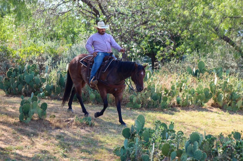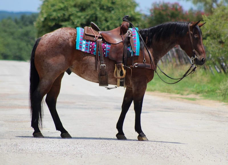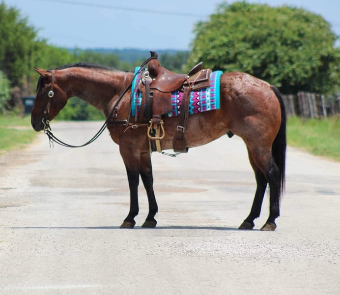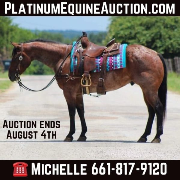 ONLINE AUCTION Place your bids at www.PlatinumEquineAuction.com Starting Bid $3500 Auction ends August 4th, 2024 Need a new saddle? Check out White Rock Saddles on our website or Facebook! Pablo is a stunning 7 year old bay roan gelding standing 14.3 hds tall and as wide as a mac truck ! He has an old soul demeanor to him and acts like a seasoned veteran wherever you take nothing bothers him and I mean nothing! He has been on several trail rides and hunting trips in the Rocky Mountains. He can go up and down any mountain and is sure footed . He always rides low headed and never raises his head above the saddle horn just like one should . He has been rode down the historic Forth Worth Stockyards and handled all the commotion, crowds of people , and traffic like a seasoned pro . He has zero spook to him and would ride to war if you asked him to. He is a blast to ride down the trail , he is confident and goes wherever you point him up and down hills, crosses water, bridges, logs and tarps with zero issues. He has seen many wildlife out on his adventures. In the arena he will walk , trot and lope circles with a great stop ! The great thing about him you don’t have to be a cowboy to ride as long as you can sit up there and hold the reins you can ride him wherever you want . From the trails to checking your herd of cattle he’s the one for the job . Pablo has a bright future of him and someone is going to enjoy him for many years to come . He is a barn favorite and I just know at his next home he’s gonna be the favorite also . He is the first one to meet you at the gate , he stands tied , easy to tack up and bridle , stands for the farrier, baths, loads and unloads like the perfect gentleman he is. Keep him in a stall or a pasture he doesn’t care. Contact us to come try him or we can set up a FaceTime also. If you need help with transport don’t hesitate to ask we have a list of reputable haulers that can get him safely to your doorstep world wide. Contact M $ Performance Horses Michelle 661-817-9120 Located in Stephenville, TX. ONLINE AUCTION Place your bids at www.PlatinumEquineAuction.com Starting Bid $3500 Auction ends August 4th, 2024 Need a new saddle? Check out White Rock Saddles on our website or Facebook!