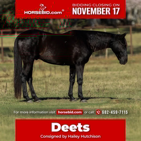 🎲𝓽𝓱𝓮 𝐑𝐈𝐃𝐄𝐑'𝐒 𝓒𝓱𝓸𝓲𝓬𝓮🎲 Happening now thru MONDAY | NOVEMBER 17th - Available EXCLUSIVELY on HorseBid's website! For more details and to register visit: www.Horsebid.com CONSIGNOR CONTACT: Hailey Hutchison 682-459-7115 LOCATION: Joshua TX BREED: Quarter Horse REGISTERED: No REGISTERED NAME: Deets COLOR: Black HEIGHT: 15 AGE: 9 GENDER: Gelding Affectionately known as “Deets” from the iconic- Lonesome Dove! Deets: “Cheerful in all weathers, never sherked a task, splendid behavior”.🖤 9 years old, 15 hands tall, and a trustworthy black gelding. Always happy to see his person, easy to catch, perfect gentleman- stands quietly tied to groom, tack up, get on, and bathe. Deets is extremely kind hearted and will win your heart over with his genuine soul.🙌🏻🥹 Solid, solid, solid- steady eddy! Deets greets everyday with a willing attitude and the kindest demeanor. Honest one hand neck rein, picks up both leads, smoothest rocking chair short lope, and goes absolutely anywhere he’s pointed- they don’t get any easier to ride than him! Laid back in a busy town atmosphere, unfazed by traffic, atvs, flags, and other livestock. A trail rider delux, and SO fun out on the trails! If safe, kind, reliable, user friendly, and extra gentle are at the top of your list, Deets is your man! Loves attention and deserves to be loved on everyday. Safe for any level rider, and would make the entire family happy! 💯❤️💌 Up to date on farrier, coggins, deworming, and dental. 🩺 📫Joshua, TX - happy to help arrange shipping!