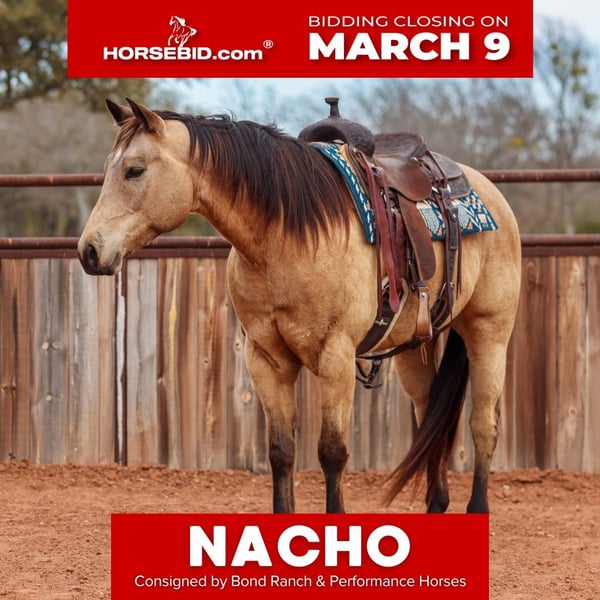 ℳ𝒶𝓇𝒸𝒽 ♦️𝐑𝐈𝐃𝐄𝐑'𝐒 𝐂𝐇𝐎𝐈𝐂𝐄♦️ Happening now thru MONDAY | MARCH 9th - Available EXCLUSIVELY on HorseBid's website! For more details and to register visit: www.Horsebid.com CONSIGNOR CONTACT: Bond Ranch & Performance Horses 615-854-6883 LOCATION: Ranger, TX BREED: QH REGISTERED: Yes REGISTERED NAME: Nacho Traffic Guy COLOR: Buckskin HEIGHT: 15.1 AGE: 9 GENDER: Gelding Nacho is a striking buckskin gelding with the kind of versatility, disposition, and eye appeal that make him a true standout. Quiet, kind, and exceptionally well-mannered, he is the type of horse that fits seamlessly into any program. Nacho has proven himself to be safe, sane and simple to ride in every situation. Fancy when it counts and gentle enough for the whole family. He handles cattle confidently, stays level-headed, and carries himself with the steadiness you want in a reliable partner. On the trail, Nacho is sure-footed and relaxed, traveling out willingly and taking new scenery in stride. In the arena, Nacho is well started on the head side and shows excellent promise as a versatile rope horse. He is responsive, soft in the bridle, and rides around with balance and style. Show pen ready and capable of stepping in to compete, he remains forgiving and suitable for riders of varying experience levels. Under English saddle, Nacho moves beautifully, carrying himself with balance and fluidity through his gaits. One of his greatest qualities is his exceptional ground manners — he is respectful, easy to handle, and a pleasure to be around in every setting. Beyond his talent and training, Nacho is incredibly sweet and personable. He genuinely enjoys attention and is easy to get along with, making him a favorite in the barn. He does not require daily riding to stay broke, maintaining his quiet, steady nature even with time off. With his eye-catching buckskin color, kind personality, and well-rounded résumé, Nacho is the kind of gelding that will make someone proud whether on the ranch, in the arena, or out on the trail.