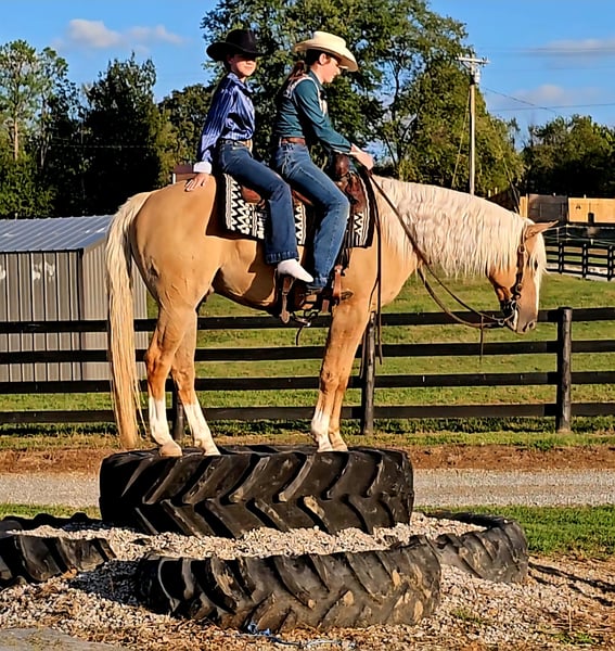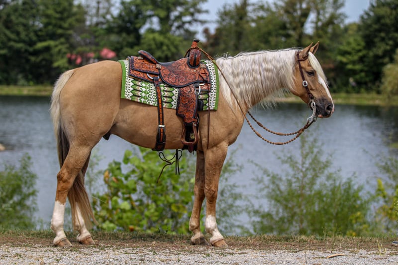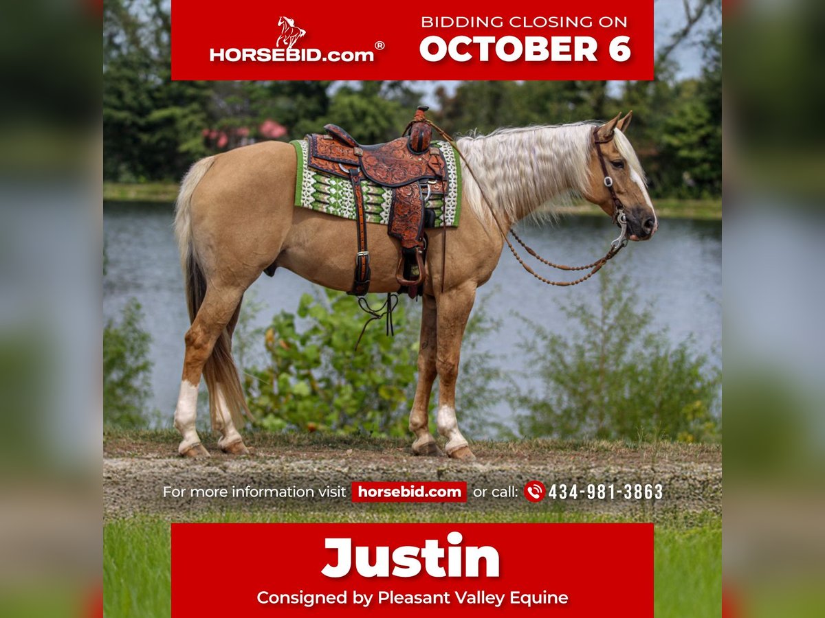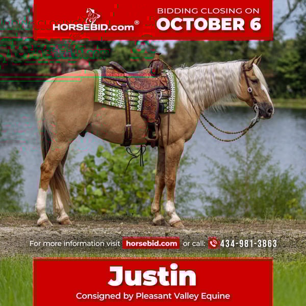 🍂 𝓐𝓾𝓽𝓾𝓶𝓷 𝑨𝑳𝑳 𝑺𝑻𝑨𝑹 𝑳𝑰𝑵𝑬𝑼𝑷 🍂 Happening now thru MONDAY | OCTOBER 6th - Available EXCLUSIVELY on HorseBid's website! For more details and to register visit: www.Horsebid.com CONSIGNOR CONTACT: Pleasant Valley Equine 434-981-3863 LOCATION: Robards KY BREED: Quarter Horse REGISTERED: Yes REGISTERED NAME: Hez A Lil Catty COLOR: Palomino HEIGHT: 15.3 AGE: 8 GENDER: Gelding BROKE, BROKE, BROKE, and SAFE ABSOLUTELY A BLAST TO RIDE. Even if you have no clue how to ride, Justin will make you look like a professional. This sweet gelding has proven himself time & time again for us. We had the privilege of being around Justin for the past 6 years. He's packed me & my 4 year old son on 3 to 4 hour trail rides, & been the Steady Eddie to pony him on his own horse through traffic, parades, & cow catching adventures. He has a calming demeanor that will make the most anxious rider feel at home & safe. Justin has been a big part of my lesson program this summer, teaching kids as young as 6 how to ride. Justin is a seasoned pro. He is currently excelling in Ranch Versatility, 4H, Trail, Western Riding, Ranch Reining, English, Equitation, Lower Level Dressage & going over small jumpes well. Justin will be everything you ever dreamed in a horse and more. He's quiet enough for any level rider, young or old! Not only is he fancy in the arena, but he's a trail horse deluxe. He will pack saddle bags and go anywhere you point him. He has encountered all types of wildlife with no spook or hesitation. If you enjoy working cattle and sorting, Justin handles a cow well. We have used him to get up & pen large herds of cattle with my 4 year old son. Justin stands right under 16 hands and weighs around 1150 lbs. He has a long, beautiful mane & and a thick, pretty tail. He even has a dun stripe & zebra striping on his legs. He's always the first to meet you in the field and can sit for weeks or months without work and be the same horse every time. He's lived most of his life out in the field with a mixed herd, but he enjoys his stall, too. I would consider him a low man in the pecking order. Justin is UTD on shots and coggins. He stands great for the farrier, baths, clips, and loads in and out the trailer with ease. He is currently shod all the way around. We can make arrangements to ship anywhere in the U.S. call today to set up an appointment to take Juston for a test ride. 434-981-3863 ◇ASK US ABOUT OUR GURANTEE ON THIS HORSE