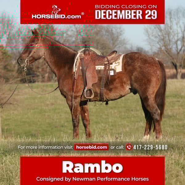 ⚜️𝐓𝐇𝐄 𝓗𝓮𝓻𝓲𝓽𝓪𝓰𝓮 𝐖𝐢𝐧𝐭𝐞𝐫 𝓒𝓵𝓪𝓼𝓼𝓲𝓬⚜️ Happening now thru MONDAY | DECEMBER 29th - Available EXCLUSIVELY on HorseBid's website! For more details and to register visit: www.Horsebid.com CONSIGNOR CONTACT: Newman Performance Horses 417-229-5680 LOCATION: Verona, MO BREED: Amarican Quarter Horse REGISTERED: Yes REGISTERED NAME: Sugar Ray Rambo COLOR: Red roan HEIGHT: 15.3 AGE: 8 GENDER: Gelding Rambo is truly an all around gentleman. He has been hauled plenty and handles every environment with ease. Good in the box, leaves flat, and stays gentle. Rambo is finished on the head side and ready to take you to the pay window. He knows his job and is accustomed to any terrain or commotion you could throw at him. Rambo is no stranger to a long days work and has worked many days outside earning his keep on the ranch doctoring yearlings, gathering cattle, and sorting pairs. This gentle giant will gladly go wherever you point him, he will cross creeks, logs, and ditches along with whatever else you might come across on the trails. At the barn Rambo is easy and simple! He has no weave, crib, bite, bolt, or rear. He is easy to bathe, groom, and tack. He jumps right on the trailer and will back off. He does not care about other horses and will go out by himself or in a group with no problems!