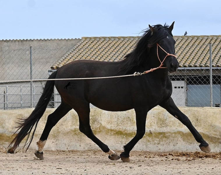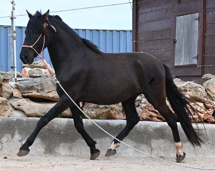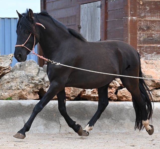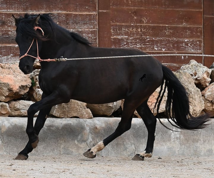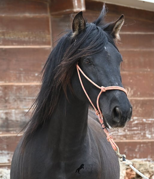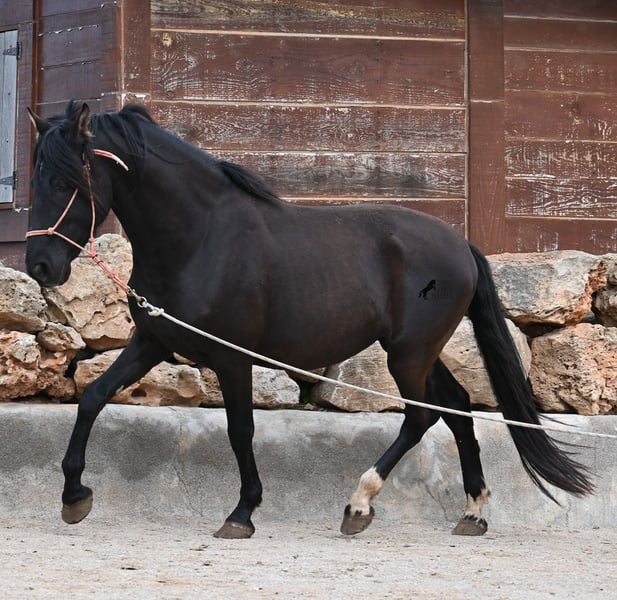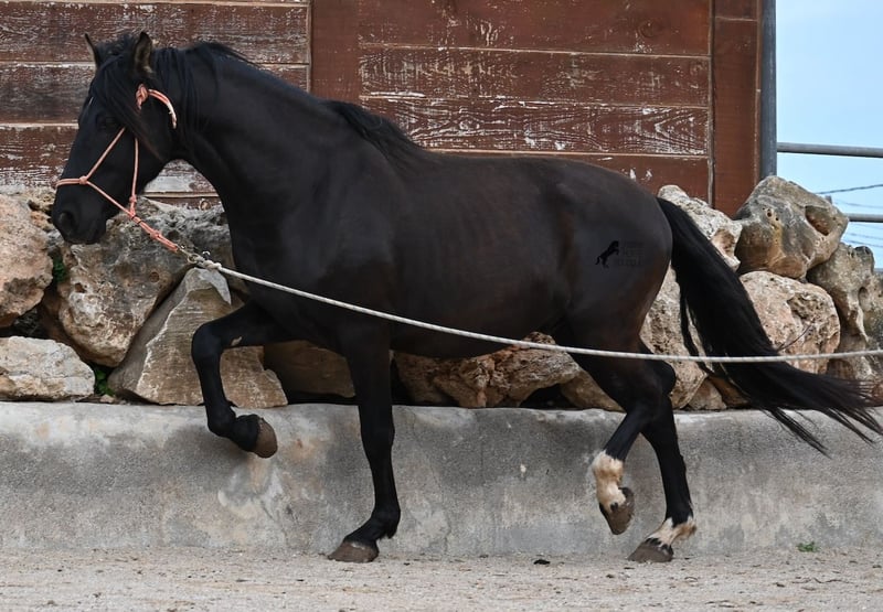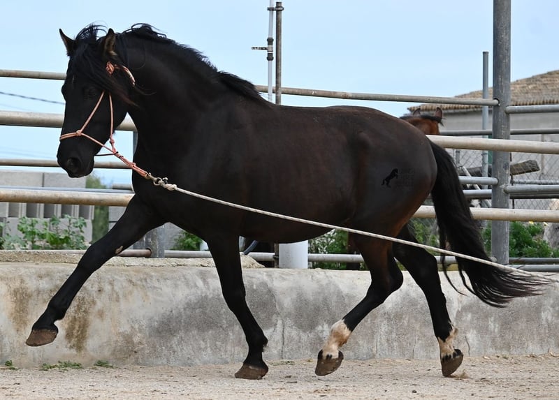 Few stallions have achieved as much success and fame as a Spanish dressage horse like POETA DE SUSAETA! He is also the sire of this impressive, baroque-looking colt, who has clearly inherited good movement as well. Born in summer 2021, this purebred Pura Raza Española stallion (Andalusian with ANCCE registration) also boasts an excellent pedigree on the dam’s side. His lineage includes the Mejorante stallion NERO II and the ELITE stallion Inedito, both renowned figures in the Spanish dressage world. Although his bloodlines are very sport-oriented, this young horse is nicely compact and baroque, which makes him even more special. His sleek black coat and gentle eyes complete the picture—what more could one wish for? He has not yet been backed, as the breeder prefers his horses to have time to grow and not be overburdened early on. This approach has paid off, as the stallion is extremely friendly, relaxed, affectionate, and overall a wonderful character. He is licensed and already has progeny; he lives a dream life—24/7 free turnout with his foal and dam! This is a very interesting opportunity for breeders, not only because of his pedigree but also due to his striking color. Perfect for those seeking an unspoiled horse partner with all doors open to leisure riding disciplines. Currently, he measures 159 cm and will likely grow a little more. He is barefoot, kept in a hardy environment, and there is the possibility of castration and/or training on-site. He is presently located in Mallorca! Videos and pedigree details are available upon request. A top-quality horse at a very fair price. I am happy to arrange on-site pre-purchase examinations, training, transport, or even your journey if you wish to view him personally. Please contact me for more details, either through my website or in conversation. Greetings from Spain!