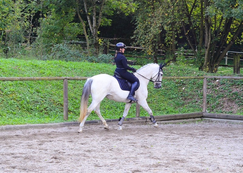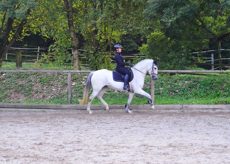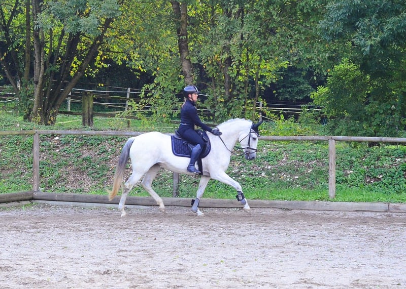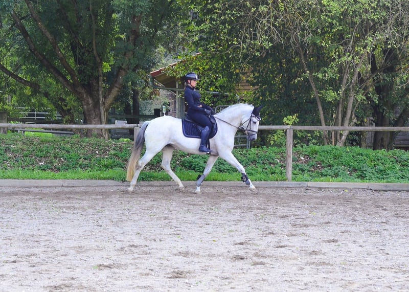 Paquita presents herself as a 13-year-old gray mare, expressive and with three excellent basic gaits. She is light in the poll, very well ridden, and has an absolutely lovable character. She is also a true treasure in handling. She is familiar with the indoor arena, outdoor arena, and trail rides. She is also recommended for Working Equitation.