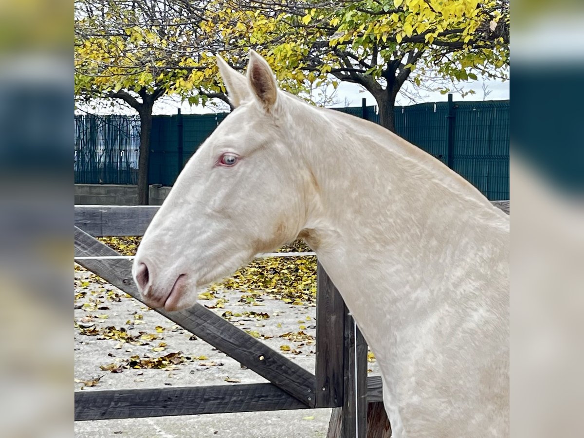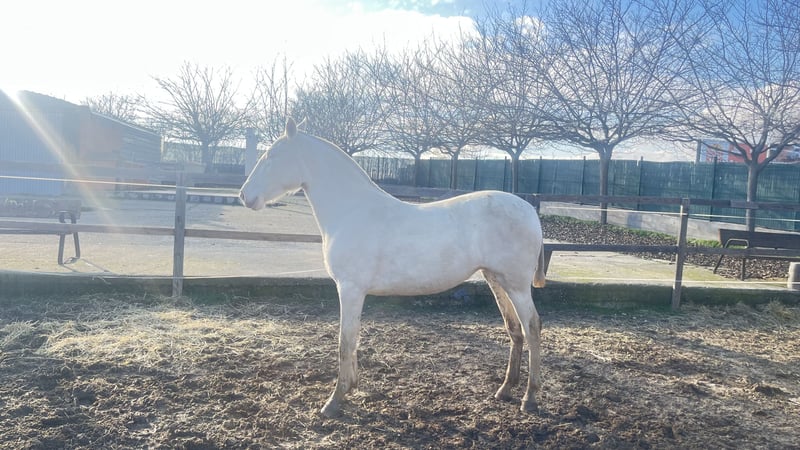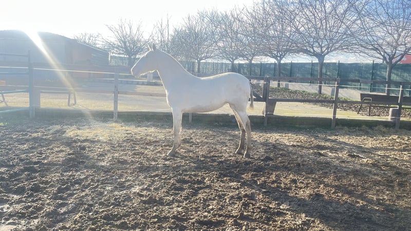 Perlino Pura Raza Española merrie uit de bloedlijn van Paco Martí. Ze is anderhalf jaar oud, barok in type, met een ramkop, sterke botstructuur en goede bewegingen. Ze zal een toekomstige fokmerrie worden, met veel lichaamsmassa en capaciteit om bijzondere nakomelingen te produceren. Geïnteresseerden voor meer informatie of om een bezoek te regelen, worden verzocht het in de advertentie vermelde nummer te bellen. Dank u wel. #perlino, #cremello, #roomkleurig, #verdund, #PRE, #albino, #fokkerij