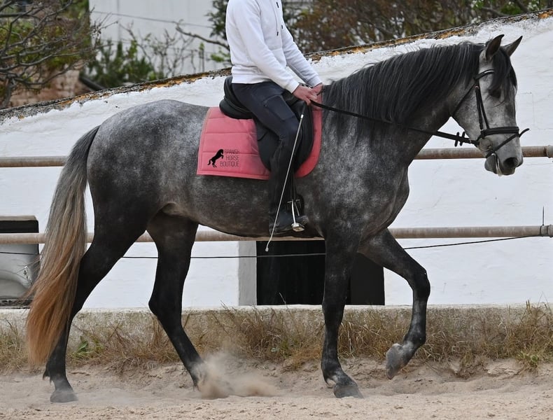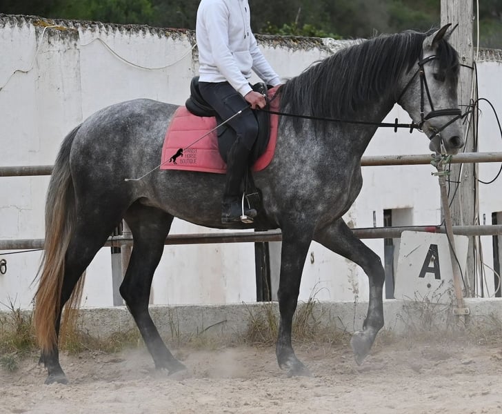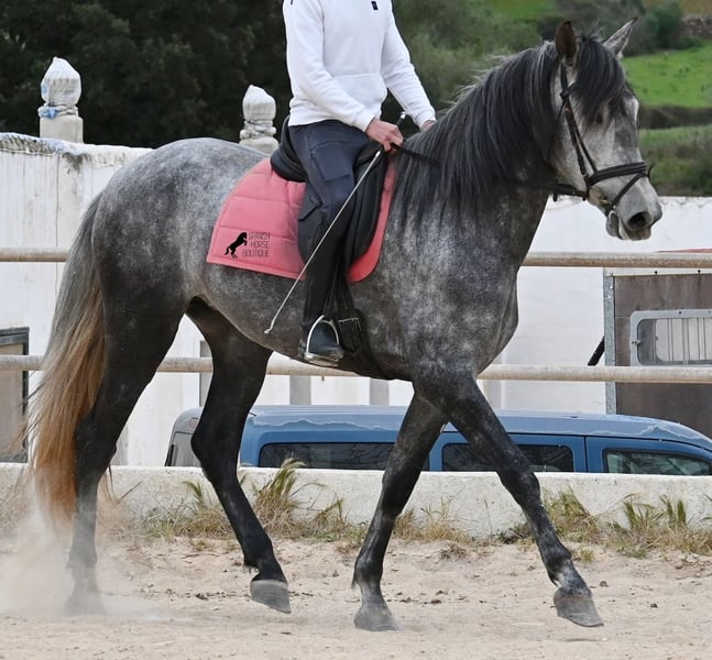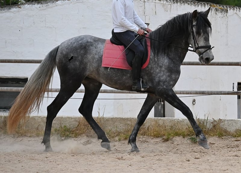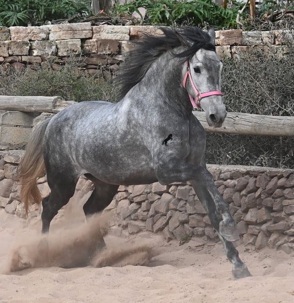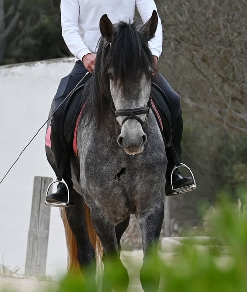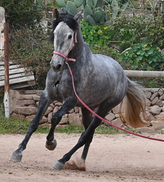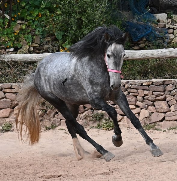 Este caballo, que ya mide impresionantes 170 cm, es un pura raza PRE de 2022 (Andaluz con certificación de raza de la ANCCE) y está registrado como yegua. Sin embargo, lo que en un principio parecía un milagro de la naturaleza, resultó ser que también cuenta con estructuras genitales masculinas. En lenguaje coloquial, se le podría llamar hermafrodita, lo cual puede parecerte sorprendente al leer esto, pero en realidad, este ser especial ha sido creado así por la naturaleza. :) Originalmente, se planeaba criar con él, pero esto ya no es posible, ya que no entra en celo y su condición doble-sexual no permite compararlo con otros caballos en cuanto a su equilibrio hormonal. Por ello, buscamos un lugar de vida para este caballo, a un precio muy reducido. Actualmente, el caballo está siendo montado y conoce el peso del jinete en paso y trote sin riendas largas (aún se trabaja en la coordinación para el galope). Es importante señalar que, en cuanto a convivencia en manada, esto es solo parcialmente posible: los caballos machos pueden reaccionar hormonalmente al caballo, y la parte masculina del animal suele mostrar un comportamiento orgulloso y masculino. También reacciona a las yeguas, por lo que solo sería posible mantenerlo en un potro castrado, aunque esto debería probarse. Por ahora, la convivencia en box y sin problemas, tanto con caballos stallion como con yeguas en el establo. Probablemente, esta sea la mejor opción para su alojamiento, en box o paddock, para asegurar que ambas partes en el caballo puedan vivir en armonía. Una "castración química" probablemente no sería efectiva, ya que su equilibrio hormonal funciona de manera diferente. Además, no hay testículos para una castración quirúrgica. Se trata de un caballo muy especial, con carácter vivo, que se está desarrollando bien como caballo de montar y además es muy elegante, ¡todo por un precio muy asequible! Su ubicación es Menorca. Con gusto puedo organizar una revisión veterinaria en el lugar, transporte o incluso su viaje, si desea visitarlo personalmente. Para más detalles, puede consultar mi página o contactarme directamente. Saludos desde España