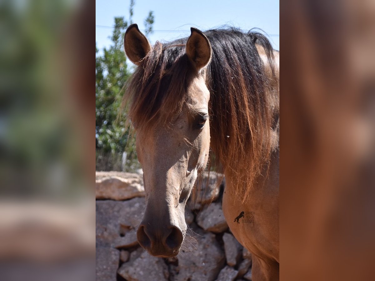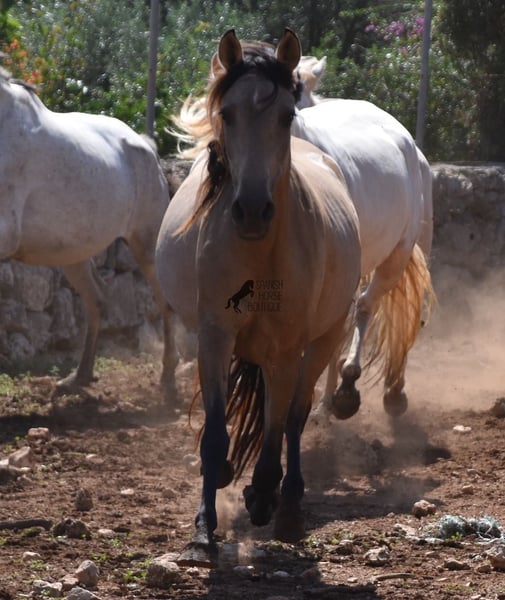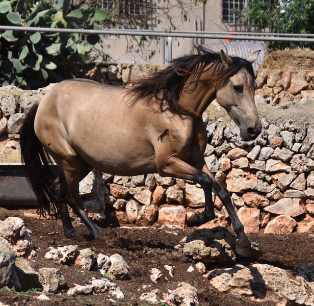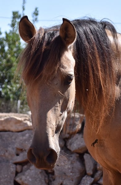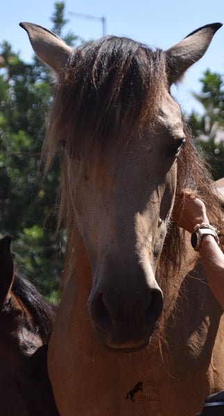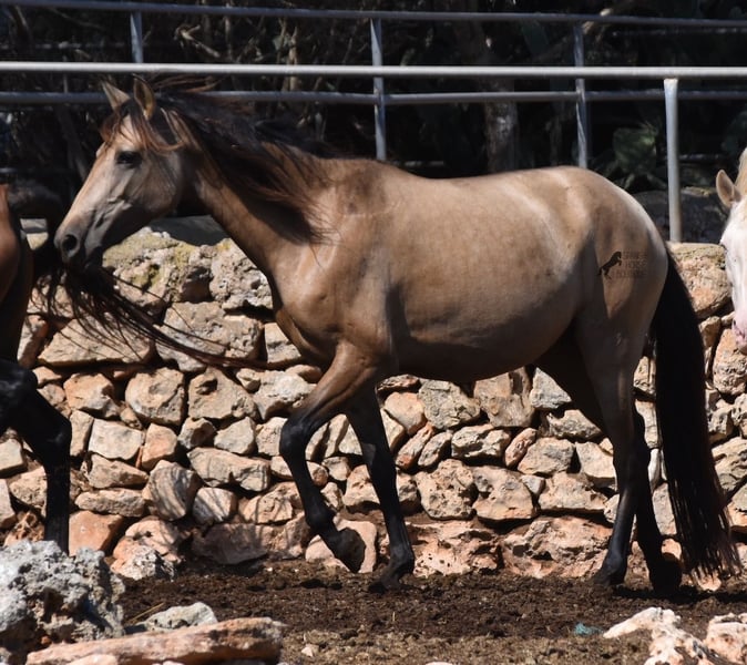 Born in 2019, this dun mare is a real raw jewel. Translated, the golden child's name means "chamomile" and she also has a very calming charisma. Although she is completely raw, she opens up within a few minutes and enjoys being cuddled and handled. She then follows you even when the herd moves in a different direction. With this people-friendly, open character, it will certainly be easy to break her in. Of course, there is also the option of organizing a ride on site. As it had rained heavily the day before, the ground was a little slippery, but she still moved beautifully and went over the rocks in the paddock like a chamois. In the herd, she is of medium to low rank and due to the 24-hour robustness, she is well socialized, resistant and well tied up, thanks to the stony ground. I estimate her final height to be 157cm, as it was not possible to measure her freely. She is currently in Mallorca! Videos and photos of the equine passport are available on request. I would be happy to organize an AKU, riding, transport or even your trip if you come to see her in person. Details can be found on my website or in conversation. Location