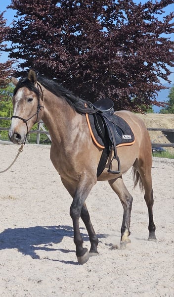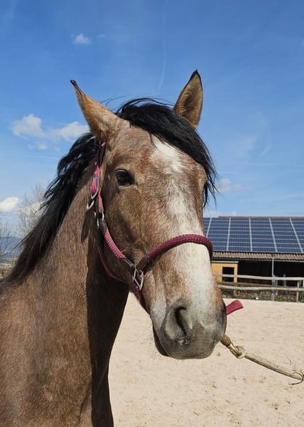 Mein Name ist Khan, geboren am 10.6.23. Meine Eltern: Serenata PRE Stute mit NCCE Papieren, Rifai Berber -Araber Hengst mit OMCB Papieren. Ich bin schön gewachsen, (noch im Wachstum), Stockmass 1.56. Am 8.April 2026 wurde ich gelegt. Meine Ausbildung ist im vollen Gang. Ich kenne das Fohlen ABC, lasse mich gut führen und kenne das Longieren. Ich werde sorgfältig ans Anreiten herangeführt: Sattel, Satteldecke und Sattelgurt bereiten mir keine Probleme. Meine Ausbilderin hat mir auch das Gefühl, ein Bein auf dem Rücken zu haben, vermittelt. Demnächst werde ich wohl auch schon angeritten. Ich kenne den Peitschenbefehl zum Parkieren an die Aufstiegshilfe, kann sogar auf Pfiff parkieren und bleibe ruhig stehen. Das Einsteigen in den Trailer kenne ich, muss es aber noch perfektionieren. Ich habe auf dem Hof und beim Spazieren mit meinem Besitzer schon etliche Maschinen und allerhand Fahrzeuge kennengelernt und lasse mich nicht so schnell aus der Ruhe bringen. Ich bin ein tolles, liebenswertes, temperamentvolles, menschenbezogenes, neugieriges und elegantes Pferd; ein idealer Freizeitpartner! Am liebsten möchte ich in einem Offenstall leben… Gegenwärtig stehe ich noch auf der Hengstfohlenweide nahe Bern. Mein Besitzer, Georg Spörri 077 415 77 48 oder hgspoerri@proton.me macht gerne einen Besichtigungstermin mit Dir aus.