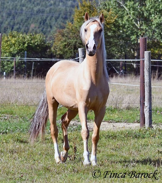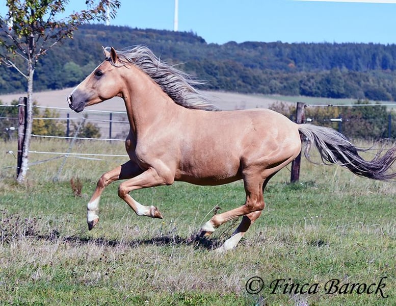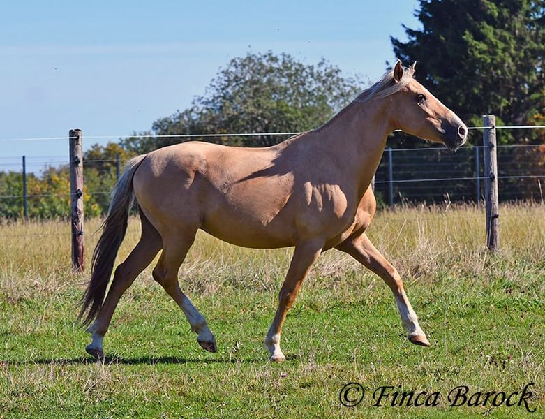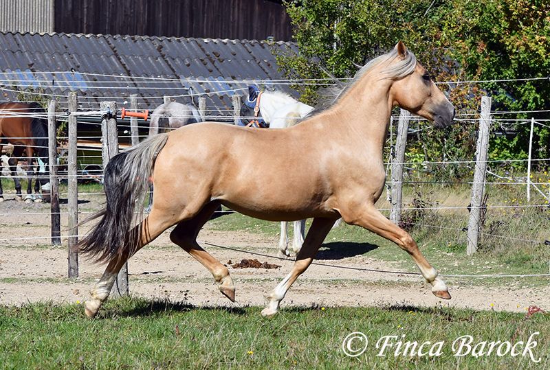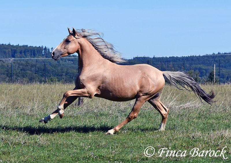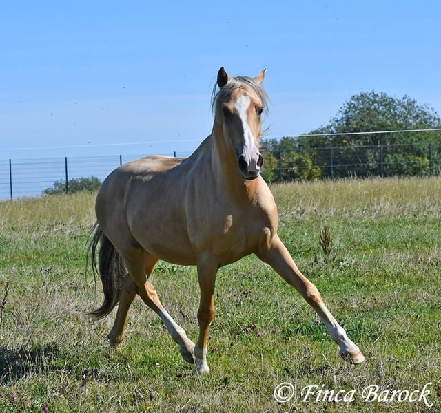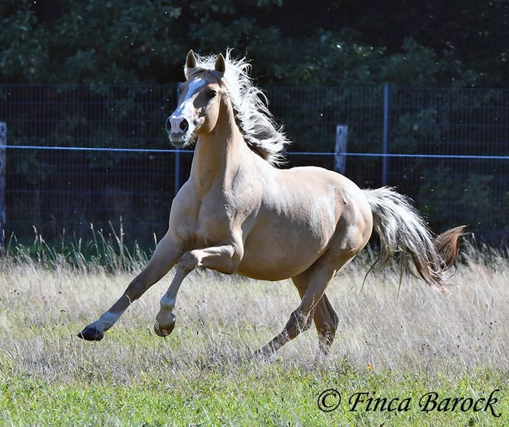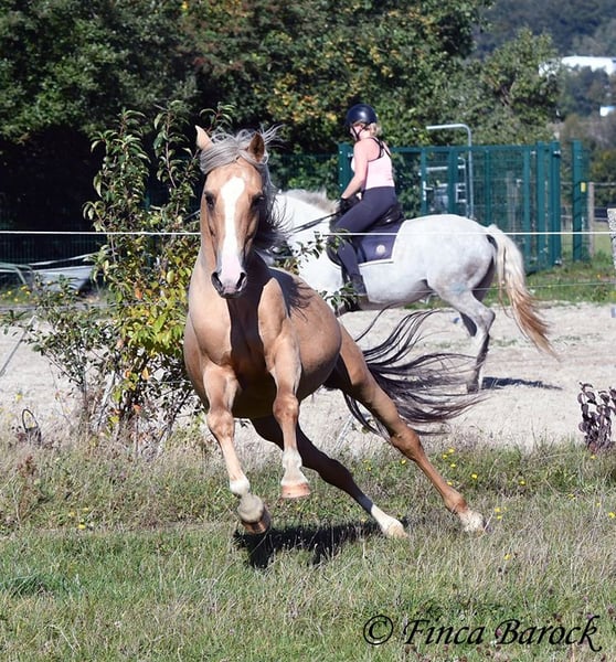 Breed: Andalusian Name: Lamborgini Gender: Gelding Height: 146 cm Age: 14.04.2020 Color: Palomino Price: €7700 Father: n/a Mother: n/a Lamborgini, a little guy in a stylish jacket with a friendly character! With his silver mane, he is an absolute rarity! Despite his size, he covers ground very well and is still fully in development. He will definitely continue to grow. Lambo is solidly trained in the basic gaits. The focus has clearly been on trail riding for him. He has experienced more of the world outside than in the arena. He loves trail riding, shows little concern for the environment, and goes out alone as well. In the arena, we are currently refining the basics; he learns something new in every session. Even with less experienced riders, he shows himself to be exceptionally well-behaved and polite. He wants to please and tries to respond to new aids for him. A fantastic boy for the smaller rider who is looking for a horse that enjoys trail riding but is also motivated in the arena. Lamborgini has already undergone a clinical examination (without abnormalities) and X-rays. As he has a finding (cartilage chip), he is being offered at a significantly lower price. Contact: Finca Barock, Tel. 0173-696 31 81, 56291 Wiebelsheim