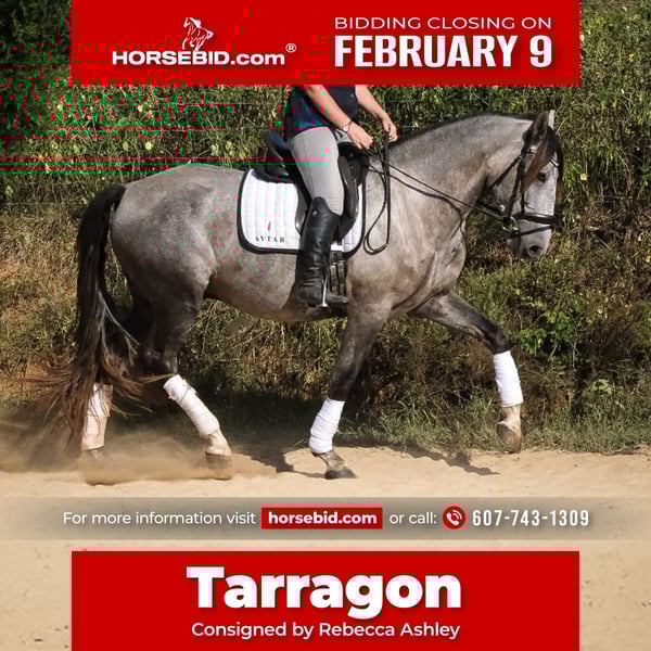 ❤️🔥𝑩𝒆 𝑴𝒊𝒏𝒆 𝐒𝐄𝐋𝐄𝐂𝐓❤️🔥 Happening now thru MONDAY | FEBRUARY 9th - Available EXCLUSIVELY on HorseBid's website! For more details and to register visit: www.Horsebid.com CONSIGNOR CONTACT: Rebecca Ashley 607-743-1309 LOCATION: Troutman, NC BREED: Andalusian REGISTERED: Yes REGISTERED NAME: RHF Tarragon COLOR: Grey HEIGHT: 16 AGE: 5 GENDER: Gelding Tarragon is a 5-year-old registered PRE Andalusian gelding with an exceptional brain and a very amateur-friendly temperament. He is soft, straightforward, and uncomplicated to ride, comfortably going on a loose rein or stepping into correct contact when asked. Although trained in dressage, Tarragon is versatile and could easily transition to western disciplines, including Ranch Horse classes, Horsemanship, and Western Dressage. He has an excellent foundation with lateral work and balanced transitions, including leg yield, shoulder-fore, shoulder-in, haunches-in, half pass, extension, and collection. Tarragon was competed at the 2025 IALHA Championships at WEC Ocala, placing 4th out of 13 horses in a large Dressage Suitability class. He is currently schooling Second Level dressage. He has a green flying change in one direction and confirmed simple changes. He is extremely comfortable to ride, with smooth gaits that feel slow and easy in the saddle even when moving forward. He has good brakes and a reliable stop, making him suitable for timid or amateur riders. If unsure, he will quietly stop and assess rather than react. Tarragon is excellent in show environments and enjoys going new places. He is easy to haul, stands tied at the trailer, and handles day parking and showgrounds without issue. He lives outside 24/7 but stalls easily at overnight shows. He is kind with kids and teen riders and remains rideable and forgiving, though like any young horse, he benefits from clear, consistent aids. He stands quietly at the mounting block for mounting and dismounting and is easy to handle on the ground, in cross-ties, and when leading. He can have time off and come back the same horse. He is food motivated, eager to learn, and consistently wins over amateur riders. His breeder is supportive of showing and may assist the new owner with stalls or entry fees once per year at IALHA-recognized shows. Virtual lessons and post-sale support are available to ensure a successful transition for Tarragon and his new rider.