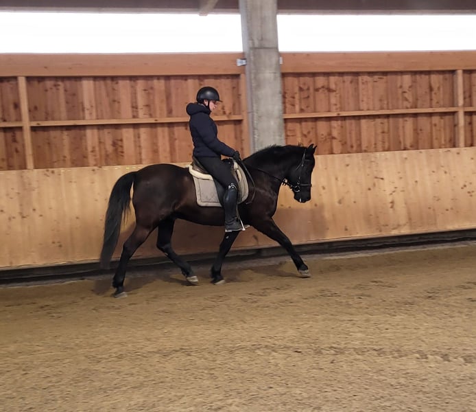 ENZO ist ein wunderschöner, kräftiger, sehr eleganter dunkelbrauner Wallach der Extraklasse. Seine Ruhe und Gelassenheit lassen auch einem noch etwas unsicheren Reiter sehr schnell Vertrauen zu diesem Prachtburschen fassen. ENZO verzeiht Reitfehler und pariert durch, wenn er merkt, dass sein Reiter unsicher wird. ENZO ist ein Pferd, dass auf seinen Reiter im wahrsten Sinne des Wortes, aufpasst. ENZO ist sehr leichtrittig und bequem zu sitzen. Er hat drei wunderschöne Grundgangarten. Er ist sehr menschenbezogen und liebt es betüddelt zu werden. Besonders liebt er die Arbeit mit Kindern und Jugendlichen. Wir haben noch nichts entdecken können, was diesen Prachtburschen großartig aus seiner Ruhe bringen hätte können. Ob im Viereck, Allwetterplatz oder im Gelände, ENZO marschiert voran, ist nicht triebig, aber auch nicht zu flott unterwegs. ENZO ist ein Pferd, dass sich den Ansprüchen seines Reiters anpasst, der sich auf seinen Reiter einstellt. Nicht nur unter dem Sattel, sondern auch bei der Bodenarbeit und im alltäglichen Umgang vermittelt ENZO durch sein gutmütiges Gemüt Sicherheit und zeigt auch sein großes Vertrauen zum Menschen. Wir können uns ENZO bei weiterer Ausbildung auch sehr gut als THERA-Pferd oder im Schulbetrieb vorstellen. Ein Pferd, dass seinen Menschen nicht jeden Tag vor neue Herausforderungen stellt. Nähere Informationen über unsere Pferde und unsere Arbeit erhalten Sie unter 0171/5269002 Hubert Seitle und 0151/12775701 Uta Großmann. Allgemeine Informationen über unsere Pferde und unsere Arbeit erhalten Sie auch unter www.ps-seitle.de