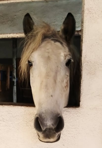 Deze prachtige 8-jarige en ongeveer 1,50 m grote appelschimmelhengst zoekt zijn mensen met paardenverstand voor een forever home. Een recreatief gereden paard, zoals bijna niet mooier te krijgen is, met boterzachte gangen en een gelijkmatig ritme. Zijn zeer mooie manen en sympathieke karakter maken hem tot een droompaard om verliefd op te worden. Hij is in de omgang volledig gemakkelijk en braaf, maar merkt heel snel wie de baas is. Een hoogintelligent paard met karakter, dat zijn grenzen graag test – charmant en tegelijk speels. Hij maakt gewoon plezier en met hem wordt het nooit saai, omdat hij altijd goed gehumeurd en in voor een grap is. De jongen heeft een iets stevigere bouw en doet bijna alles zonder problemen. Hij kent mennen, buitenritten, wegverkeer, rijbaan, hal, roundpen, afspoelen, aan de longeer, aanlijnen, poetsen, hoefsmid, dierenarts... etc. Alles wat een paard in de dagelijkse omgang nodig heeft. Daarnaast is hij sociaal in de kudde en staat momenteel overdag met een ruin en een hengst op een stukje weiland en ’s nachts in zijn box. 24/7 weidegang wordt uitdrukkelijk NIET aanbevolen, omdat hij extreem licht gevoederd is! Hij is het perfecte paard voor een veulenkudde of jonge paarden, omdat hij graag met hen speelt en voor orde zorgt, zonder boos te worden. Momenteel pakken we het werken buiten weer op, omdat dat in ons berggebied in de winter door de sneeuw en het slechte weer bijna onmogelijk is. Hij leert extreem snel, is wat drijfvaardig en heeft op sommige dagen wat motivatie nodig om aan het werk te gaan. Op de rijbaan is hij in alle drie de gangen goed te rijden, maar hij heeft een zelfverzekerde ruiter nodig die hem goed kan leiden. Daarom is hij GEEN beginnerspaard! In de weideperiode is hij het meest ontspannen paard, zowel op het rijterrein als in de hal – dan laat hij zich soms wat meer vragen. In de paddockperiode heeft hij een heel prettig go. Hij wil werken, doet dat heel goed en wil graag gefallen. Hij houdt ook van afwisseling en gaat graag aan de longe, dubbele longe of doet grondwerk. Stangenwerk is niet zijn favoriete bezigheid. Natuurlijk heeft hij nog verdere begeleiding nodig om zijn evenwicht beter te vinden en zoekt hij soms zelf naar het bit – dit wijst al op een zachte aanleuning, die met de juiste training nog aanzienlijk kan verbeteren. Hij heeft een consequente persoon nodig die hem duidelijk vertelt wat hij wel en niet mag. Met hem aan je zijde wordt hij een geweldige vriend en gaat hij door dik en dun. Hij is bij ons nog nooit ziek geweest, wordt regelmatig ontwormd en wordt voorgesteld aan de hoefsmid. Hij is barefoot, maar kent ook ijzers of duplos. Daarnaast heeft hij röntgenfoto’s van de benen zonder afwijkingen uit 2022. Met verdere training en routine zal zijn prijs stijgen. Wij kunnen ons hem heel goed voorstellen in een kleine, privé open stal, waar hij een paar lieve vriendjes heeft. Hij kan niet goed overweg met chagrijnige of ranghoofdige merries. Hij heeft echter ’s nachts zijn box nodig om tot rust te komen, omdat hij heel speels is. Wie door deze prachtige schimmel aangesproken wordt – neem gerust contact op. Voor proefritten rekenen wij €35 per paard en ruiter om reittourisme te voorkomen. Alleen kijken kost €15. Dit bedrag wordt bij aankoop van het paard van de koopprijs afgetrokken.