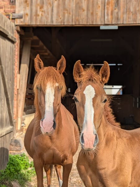 For sale is the 12-year-old chestnut mare "Coolcarty Star." Carty was born in Ireland in 2013 and was imported to Germany in 2022. She is registered with the I.P.S.E. in Ireland and had a foal in 2024, for which she was registered with the ZSSE here. Carty is kept in a herd in an open stable but is also familiar with a box stall. She tends to be somewhat subordinate around other horses. In handling, she is always friendly and reserved. Carty is farrier- and loading-safe, can be ridden alone from the stable, and is accustomed to being led in the terrain as a ground horse. She knows ground work, lunging, and double lunging. It is evident that she is very sensitive and attentive to body language. This sensitivity continues under saddle, so she needs a calm and confident rider who can provide her with security and does not panic or cling if she shows some "go." Due to my other horses, I do not have enough time to work with her regularly. Therefore, she is not suitable for beginners, insecure, or nervous riders. At nearly pony size, she is also not a weight carrier. Carty has been regularly vaccinated here and has been seen by the hoof care specialist. If interested, please contact via email at: Elisabeth.gottlob@googlemail.com