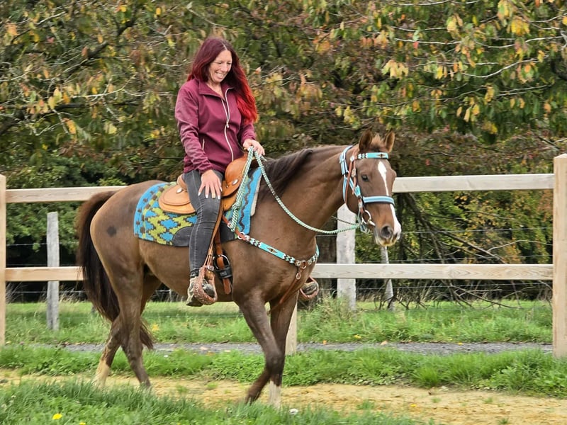 Freizeitstute -Mix-Stute für Freizeit und Gelände* *Alter*: 12 Jahre geritten *Stockmaß*: ca. 1,55 m *Ausstattung*: E-Pass, Microchip und AKU vorhanden *Preis*: .5400 € Eine schöne Stute die sich ideal für das Gelände- und Wanderreiten eignet. Sie ist ein vielseitiges Freizeitpferd, das sowohl für englisches als auch für westliches Reiten bestens geeignet ist . Sie hat ein tolles, ausgeglichenes Wesen und fühlt sich in der Herde wohl, ist aber auch in der Box gut aufgehoben. ### *Das zeichnet sie aus:* - Offenstall- und Herdenhaltung gewohnt, Boxenhaltung ist ebenfalls kein Problem - Ideal für Freizeit- und Geländereiter - Sehr ausgeglichen und unkompliziert im Umgang *Interesse?* Rufen Sie uns gerne an unter *0171-4001968* (täglich von 8–20 Uhr). *Bitte keine Mails oder WhatsApp, nur Anrufe!* *Zusätzliche Informationen:* - Zubehör und Transport können günstig organisiert werden. - Unser Hofladen bietet eine kleine Auswahl an gebrauchten Westernsätteln. - *Ratenzahlung ist nicht möglich.* *Service für Kunden:* - Jeder Kunde erhält ein vertraglich festgesetztes *Umtauschrecht von drei Monaten.* - Ein Proberitt bei uns ist möglich, damit Sie Ihr Traumpferd kennenlernen können. Für 35 Euro können Sie reiten, sich ihn vorreiten lassen, spazieren gehen oder mehr. Auf Wunsch können Sie auch ein zweites Pferd testen für 25,- . Dieser Betrag wird beim Kauf eines Pferdes am gleichen Tag selbstverständlich verrechnet. *Besonderheiten:* - Bei sofortiger Abholung mit Pferdeanhänger erhalten Sie *einen Nachlass von 100 Euro.* - Wir absolvieren den Verkauf mit einem transparenten Proberitt, um sicherzustellen, dass es das richtige Pferd für Sie ist. *Rechtliches:* - Wir sind alleinige und uneingeschränkte Eigentümer der Bilder; die Bildrechte liegen bei uns. *Fremdverwendung der Bilder ist verboten.* - Bitte beachten Sie, dass es sich um ein lebendes Pferd handelt. Unsere Angaben basieren auf den Eindrücken des Betreuers und stellen keine zugesicherten Eigenschaften dar. - Anzeigen werden sofort gelöscht, sobald die Pferde verkauft sind. *Interesse?* Rufen Sie uns gerne an unter *0171-4001968* (täglich von 8–20 Uhr). *Bitte keine Mails oder WhatsApp, nur Anrufe!