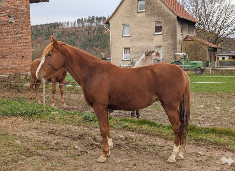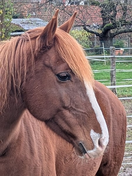 Zum Verkauf steht die 12-jährige Fuchsstute "Coolcarty Star". Carty wurde 2013 in Irland geboren, und 2022 nach Deutschland importiert. Sie ist in Irland beim I.P.S.E registriert, hier hatte sie 2024 ein Fohlen und wurde dafür beim ZSSE registriert. Carty steht hier im Offenstall, kennt aber auch die Box. Anderen Pferden gegenüber zeigt sie sich eher rangniedrig. Im Umgang ist sie immer freundlich und zurückhaltend. Carty ist Schmiede- und verladefromm, geht alleine vom Stall weg und kennt es als Handpferd ins Gelände zu gehen. Sie kennt Bodenarbeit, Longe und Dpppellonge. Dabei sieht man das sie sehr sensibel und auf Körpersprache achtend ist. Unter dem Reiter setzt sich das fort, deshalb braucht Carty einen ruhigen und sicheren Reiter, der ihr Sicherheit vermittelt, und der nicht gleich erschreckt und klammert, wenn sie mal etwas "Go" zeigt. Durch meine anderen Pferde finde ich aber nicht genügend Zeit dafür, sie regelmäßig zu arbeiten. Deshalb ausdrücklich nichts fûr Anfänger, unsichere, oder ängstliche Reiter. Durch ihre Größe knapp aus dem Ponymaß auch kein Gewichtsträger. Carty wurde hier regelmäßig geimpft und dem Hufpfleger vorgestellt. Bei Interesse bitte an folgende E Mail schreiben: Elisabeth.gottlob@googlemail.com