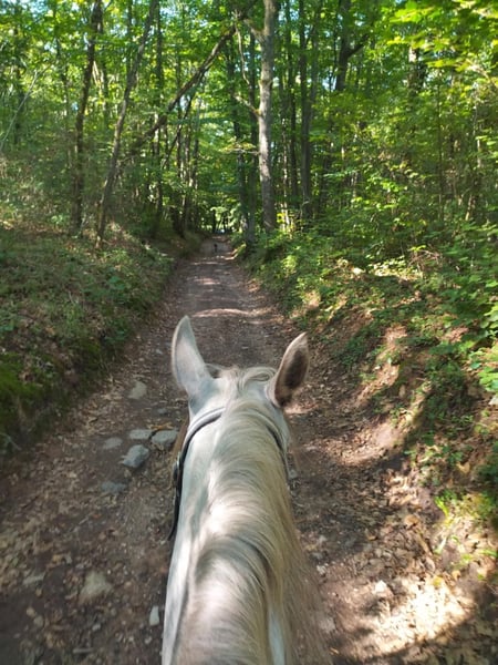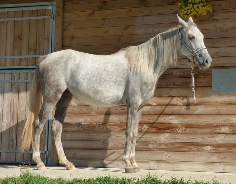 Madonna ONC (arabe) Jument 4 ans 1m46 Madonna est d'une grande douceur, elle est aussi intelligente que bienveillante et il suffit de lui expliquer une fois pour qu'elle comprenne et donne ensuite la bonne réponse. Elle est montée en filet et en licol aux trois allures. On pourrait très vite aller vers une équitation en cordelette avec elle tant elle est à l'écoute de son cavalier. Elle connaît l'incurvation, les déplacements des épaules et des hanches ainsi que le reculer. Elle commence à se tendre et à travailler dans décontraction et la rondeur, c'est une petite jument très agréable sur le plat, elle est fine dans les aides, en avant tout en étant posée dans sa tête. Elle a commencé l'obstacle, elle enchaîne un petit parcours simple au galop. Elle est franche ce n'est pas une jument regardante. Elle sort seule en extérieur aux trois allures, elle y est aussi à l'aise qu'en carrière. Elle n'est pas peureuse ni inquiète de nature, elle est déjà confiante, elle découvre tout avec intelligence. Madonna pourra convenir à tous les profils de cavaliers, petits niveaux (à partir d'un galop 3 pour l'instant) comme plus élevés.Elle est polyvalente, elle pourrait faire une bonne jument de club. La seule contrainte est qu'elle est très fine, elle ne peut convenir que pour des cavaliers très légers, max 60 kg tant que la croissance n'est pas terminée. Elle monte et voyage bien en van. Elle est à jour de parage, vaccins, vermifuge et dentiste. Madonna est visible à Saint-Romain-sous-Gourdon (71230) en Saône et Loire