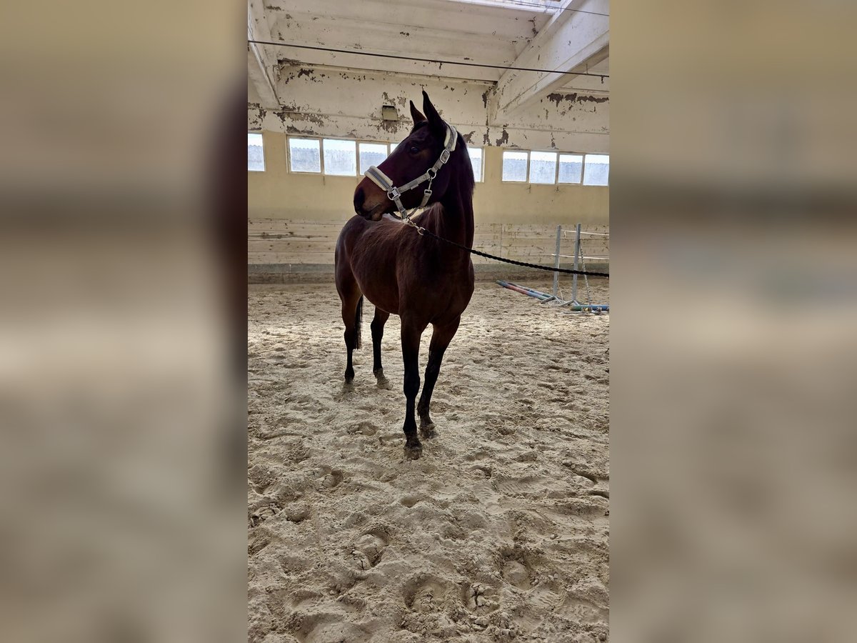 She is of a smaller frame, approximately 163 cm tall, and is currently in the process of being backed and trained under saddle. She has a very good and willing temperament, and with some further work she will make a good sport horse. Vet check✅