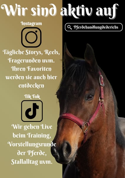 Ricky ist ein 2014 geborener Wallach ca. 1,62 cm v. Alkaadhem x Green Desert *Ricky* ist ein schicker Allrounder. Er geht in Bahn und Gelände, ist ein toller Freizeitpartner. Fremde Umgebungen machen im nichts aus. Ricky geht auch gerne ins Wasser. !!! SCHAUEN SIE SICH UNBEDINGT SEIN VIDEO AN !!! Im Umgang super lieb aber bei fremden schonmal skeptischer. Er bringt 3 schöne GGA mit. Er hat einen super feinen Charakter und möchte gefallen. Ein aktuelles Video finden Sie hier in der Anzeige oder unter folgendem Link: https://www.youtube.com/watch?v=irOK2jB1Eq0 Pferdehandlung Dederichs – Ihr Partner für den Pferdekauf Kontakt & Erreichbarkeit: Anfragen bitte ausschließlich telefonisch unter 0173/9792139 Montag – Freitag: 09:00 – 18:00 Uhr Samstag: 09:00 – 15:00 Uhr Sonntag: Ruhetag Folgen Sie uns auf Social Media! Erleben Sie unseren Alltag mit den Verkaufspferden auf Instagram, TikTok & Facebook unter Pferdehandlung Dederichs Rabatt: Bei sofortiger Mitnahme Ihres neuen Traumpferdes erhalten Sie zwischen 5 %– 10 % Rabatt Probereiten & Vorführen: • Probereiten: 30 € pro Pferd (max. 2 Reiter), Betrag wird beim Kauf angerechnet • Feiertage: Proberitt 50 € • Vorführung durch unsere Bereiter: 25 € pro Pferd (Vorreiten, Bodenarbeit etc.) Ankaufsuntersuchung & Transport: • Viele unserer Pferde besitzen bereits eine AKU • Sie können selbstverständlich Ihren eigenen Tierarzt mitbringen • Gerne organisieren wir eine Untersuchung • Wir unterstützen Sie auch gerne beim Transport ins neue Zuhause Weitere Verkaufspferde: In unserem Stall stehen weitere Verkaufspferde, die noch nicht online sind. Falls Ihr Traumpferd noch nicht dabei ist, zögern Sie nicht, uns zu kontaktieren. Wichtige Hinweise: • Stockmaß-Angaben sind geschätzt und nicht exakt nachgemessen • Alle Beschreibungen sind subjektive Einschätzungen des Verkäufers und keine zugesicherten Eigenschaften