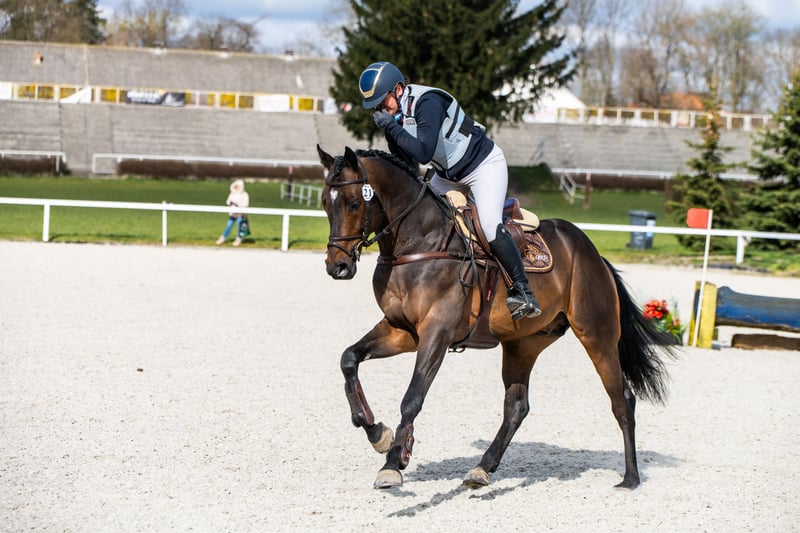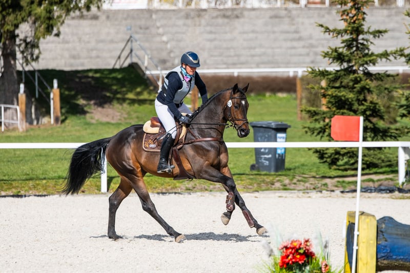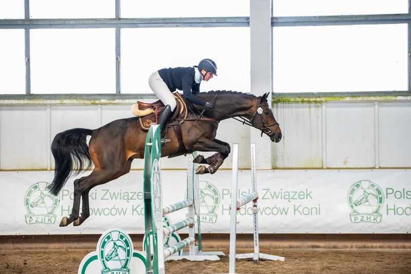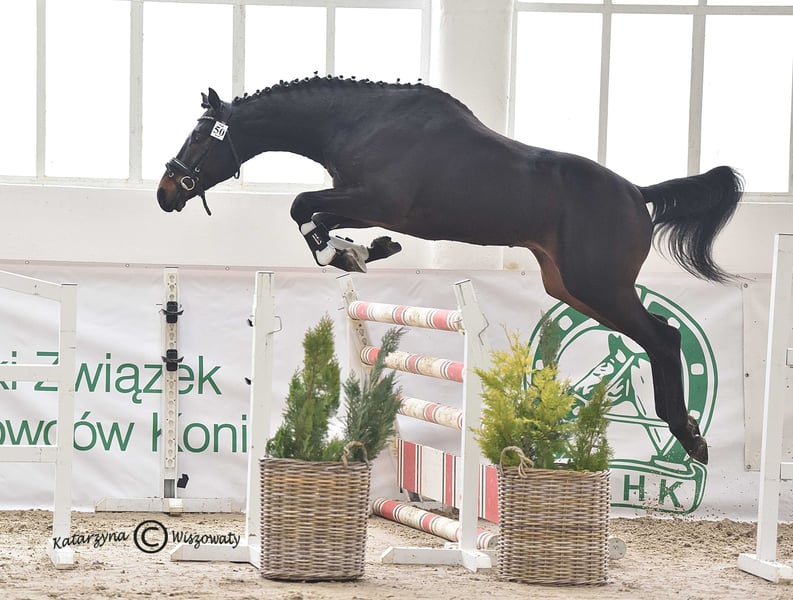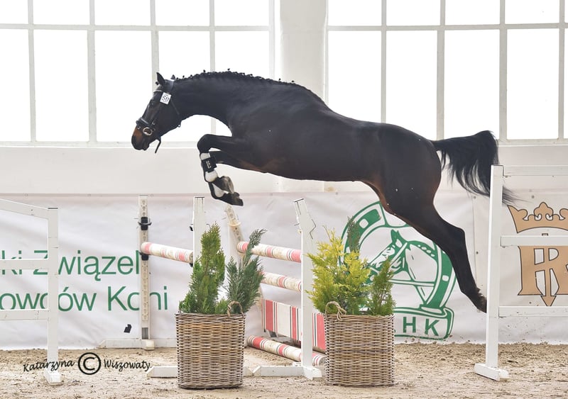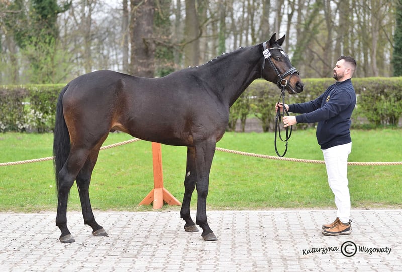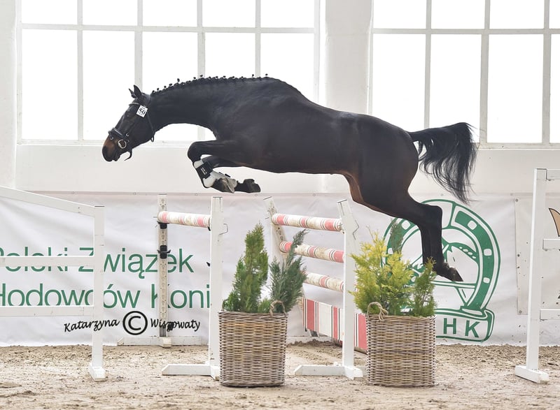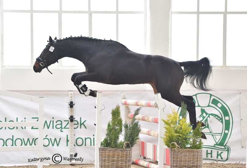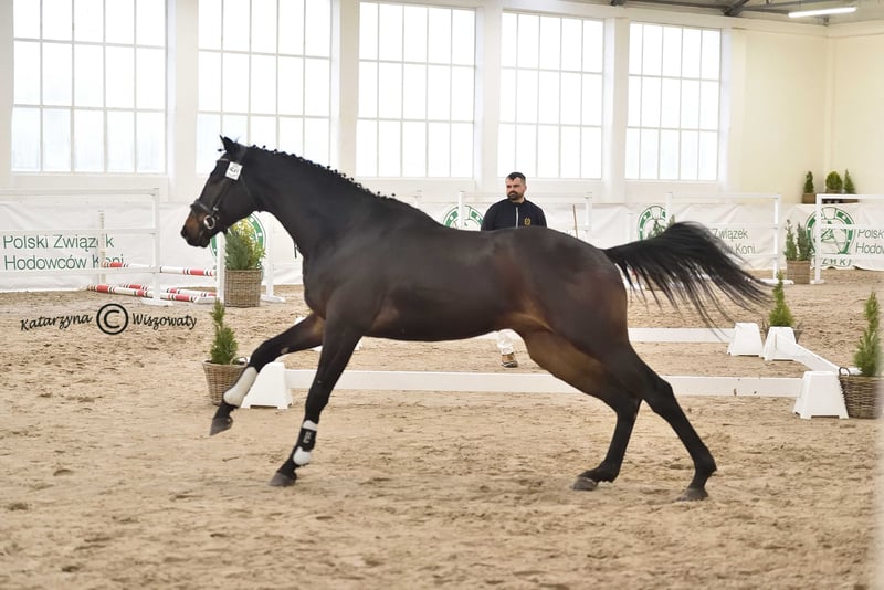 Milagro AA, sired by Huncwot out of Mandala by Dionizos, is an Anglo-Arabian stallion with a dark bay coat, born on February 26, 2020. His measurements are 164-186-21 cm, and he scored 78 points in the breed inspection. This young, noble stallion from the Małopolska breed exhibits a good and correct conformation (special attention should be paid to his large, well-formed hooves). He moves well in all three basic gaits and demonstrates excellent technique and strength in jumping, with consistent performance confirmed by high scores at every competition. He has a very good character and a balanced temperament. Milagro AA is registered in the Małopolska Breed Resource Conservation Program. Major achievements of Milagro AA: • Winner of the Equestrian Field Trial for Małopolska breed horses, Group C, Bogusławice, April 7-8, 2025, final score 7.3 (awarded a lifetime breeding license for mares). • HZR and HZT in Dressage at Łąck, October 20, 2024, rider Marta Dziak-Gierlicz, result in L2 – 64.545%, 2nd place. • HZR and HZT in Dressage at Łąck, October 19, 2024, rider Marta Dziak-Gierlicz, result in L1 – 63.684%, 4th place. • M5 / 4-year-old Qualification for Małopolska Young Horses / El. for MPMK, Becker Sport, July 21, 2024 – qualification for the Polish Young Horse Championships, rider Marta Dziak-Gierlicz, final result – 70.80% (7.08). • During the IV Open Championship of Noble Breed Horses in Radzionków on July 24, 2023, among 40 horses born in 2020 and 2021 with top jumping pedigrees, he achieved a very high 12th place with an overall score of 8.29 points. The foreign jury, composed of Eva Maria Broomer, Christoph F. Röwold, and Roland Metz, awarded him the following scores: type and conformation – 8.00, gallop – 8.17, jumping technique – 8.50, strength – 8.50, final score – 8.29. Eva Maria Broomer commented: “This stallion has a very good ability to clear obstacles in the corridor, excellent jumping technique, good engagement of the hind legs, and I believe he is a very promising sport horse.” • April 13-14, 2023, qualified as a young stallion for breeding and field training in Racot, placing 3rd with the highest score for corridor jumping – 7.9 points (the highest score achieved by a Group C stallion since the qualification process began). Scores: walk – 7.0, free trot – 6.9, free canter – 6.8, free jumping – 7.9, linear assessment: build – 7.5, type – 8.0, average score – 7.2. License valid until December 31, 2025. • Second Vice-Champion of Małopolska breed stallions at NCKM in Białka, June 11-12, 2022. • Award from the Polish Research Institute in Balice for the best stallion of the Małopolska breed. • 2nd place in the two-year-old stallion class at the National Małopolska Breed Horse Championships in Białka, June 11-12, 2022, with an overall score of 82.18 points. The dam of Milagro AA, Mandala, by Dionizos out of Mocca by Baryt, bred by Aleksandra Łoj, is a young mare with good, elastic movement in all three gaits, and solid technique and strength in jumping. Besides the well-established stallion Milagro AA, Mandala is also the dam of Maximus AA, qualified for PPO in 2024, by Brand Magic, grandson of Mighty Magic and Heraldik. Mandala’s sire, Dionizos, born at SK Walewice, is a modern, sport-type Małopolska stallion. Handsome, noble, with excellent movement. Under saddle, attentive and highly rideable. Winner of the stallion versatility test in Bogusławice in 2009, vice-champion of Poland in young horse jumping in 2011, and Polish young horse jumping champion in 2012. Advanced in bloodlines, son of the renowned French stallion Fraser, great-grandson of Arkus, and half-brother to Diokles, sold to Ireland. Mandala’s dam, Mocca, by Baryt out of Morfina by Emir, is a mare bred by Aleksandra Łoj, scored 81 points in the breed inspection. Mocca passed the mare versatility test with a good rating, was vice-champion at the 23rd Sitno Exhibition, and placed 2nd in the two-year-old mare class at the 11th NCKM in Białka. Mocca is also the dam of Marcepan by Huzar, vice-champion of Poland in eventing in 2016, and Modena by Szkrab, who placed 3rd in France with a score of 7.91. Additionally, she is the dam of Monolitos by Huzar, purchased as a two-year-old by French eventer Tom Carly, who showed well at the Grande Semaine de Pompadour, finishing 3rd in the 3-year-old stallion class. Currently, Monolitos is in the stables of Andrew Hoy, an Australian multi-medalist in eventing. I have videos from dressage competitions, stallion field trials, and free jumping championships. Milagro AA will be in jump training starting January 1, 2026.