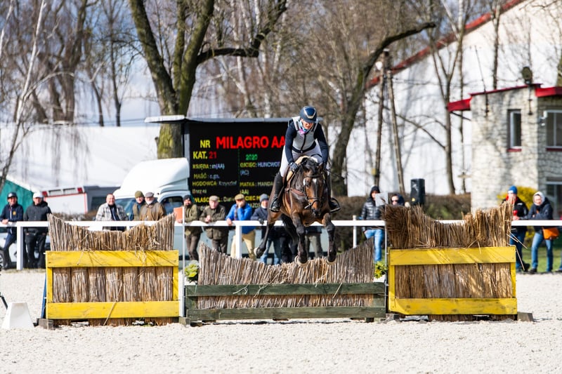Milagro AA po Huncwot od Mandala po Dionizos, Ogier rasy angloarabskiej , maści ciemnogniadej, ur. 26.02.2020r. wymiary: 164-186-21, bonitacja- 78 punktów. Młody szlachetny ogier rasy Małopolskiej o dobrej i prawidłowej budowie( szczególną uwagę trzeba zwrócić na duże i prawidłowe kopyta), koń dobrze ruszający się w trzech podstawowych chodach , koń obdarzony bardzo dobrą techniką i siłą w skoku, w skokach jest powtarzalny( co potwierdza bardzo wysokimi ocenami na każdej imprezie), bardzo dobry charakter i zrównoważony temperament. Ogier wpisany do Programu Ochrony zasobów Genetycznych Rasy Małopolskiej. Największe osiągnięcia Milagro AA: • Zwycięzca Wierzchowej Próby Polowej grupy C dla Koni Rasy Małopolskiej, Bogusławice 07-08 kwietnia 2025r. nota końcowa- 7,3.(Uzyskanie dożywotniej licencji na krycie klaczy). • HZR i HZT w Ujeżdżeniu Łąck 20.10.2024 jeździec Marta Dziak-Gierlicz, wynik w L2- 64-545%- miejsce 2. • HZR i HZT w Ujeżdżeniu Łąck 19.10.2024 jeździec Marta Dziak-Gierlicz, wynik w L1- 63,684% - miejsce 4. • M5 / El. 4-letnie ZR / El. do MPMK Konie 4-letnie Becker Sport 21 lipca 2024 – Kwalifikacje do Mistrzostw Polski Młodych Koni Konie 4 letnie – jeździec Marta Dziak- Gierlicz wynik końcowy- 70,80%- (7,08). • Podczas IV Otwartego Czempionatu Koni Ras Szlachetnych w Radzionkowie w dniu 24 lipca 2023r. na 40 koni z rocznika 2020, 2021 o rodowodach top skokowych- zajął bardzo wysokie 12 miejsce z ogólną nota 8,29 pkt. Komisja zagraniczna w składzie: Pani Eva Maria Broomer, Pan Christoph F. Röwold oraz Pan Roland Metz przyznali mu następujące noty: typ i budowa – 8,00, galop- 8,17, technika skoku- 8,50, siła- 8,50 i ocena końcowa – 8,29pkt. Pozwolę sobie przytoczyć komentarz pani Evy Marii Broomer na temat ogiera Milagro AA- „opisuje ona tego ogiera jako posiadającego bardzo dobry zapas podczas pokonywania przeszkód w korytarzu, ma bardzo dobrą technikę skoków, dobre zaangażowanie zadnich nóg i myślę, że jest to naprawdę przyszłościowy koń sportowy”. • 13-14 kwietnia 2023r. Kwalifikacja Młodych Ogierów Ras Szlachetnych do Hodowli i Polowego Treningu Wierzchowego w Racocie zajął 3 miejsce wraz z najwyższą notą za skoki w korytarzu- 7,9 pkt. (jest to najwyższa nota jaką uzyskał ogier z grupy C od początku stworzenia Kwalifikacji ogierów do treningu wierzchowego), ocena za stęp- 7,0 pkt, kłus luzem- 6,9 pkt., galop luzem- 6,8 pkt., skoki luzem- 7,9 pkt., ocena liniowa: pokrój 7,5 pkt., typ- 8,0 pkt. średnia ocena - 7,2 pkt- czasowa licencja do 31.12.2025r. • II Wice czempion Ogierów Rasy Małopolskiej na NCKM w Białce 11-12 czerwca 2022r. • Nagroda Polskiego Instytutu Badawczego w Balicach dla Najlepszego Ogiera w typie Rasy Małopolskiej. • 2 miejsce w klasie ogierów dwuletnich na Narodowych Czempionacie Koni Rasy Małopolskiej w Białce 11-12 czerwca 2022, Ogólna nota 82,18 pkt. Matka ogiera Milagro AA Mandala po Dionizos od Mocca po Baryt hod. Aleksandra Łoja to młoda klacz obdarzona dobrym elastycznym ruchem w trzech chodach, o dobrej technice i sile w skokach. Mandala oprócz uznanego ogiera Milagro AA w tym roku, jest matką również zakwalifikowanego do PPO w 2024roku ogiera Maximus AA po Brand Magic. Maximus AA- Zwycięzca Kwalifikacji Ogierów do PPO, wnuk Mighty Magic i Heraldik. Ojcem Mandali jest Dionizos- Urodzony w SK Walewice ogier w nowoczesnym, sportowym typie konia małopolskiego. Urodziwy, szlachetny, świetny w ruchu. Pod siodłem uważny, wybitnie jezdny. Zwycięzca próby dzielności ogierów w Bogusławicach 2009, wicemistrz Polski młodych koni w skokach przez przeszkody z 2011, mistrz Polski młodych koni w skokach przez przeszkody z 2012 roku. Zaawansowany w krew, syn uznanego we Francji Frazesa, prawnuk zasłużonego Arkusa, półbrat sprzedanego do Irlandii ogiera Diokles. Matka Mandali klacz Mocca po Baryt od Morfina po Emir jest klaczą hodowli Pana Aleksandra Łoja zbonitowana na 81 punktów. Mocca zdała próbę dzielności dla klaczy z oceną dobrą, została Vice czempionką XXIII Wystawy w Sitnie, II miejsce w klasie klaczy dwuletnich na XI NCKM w Białce. Mocca jest matką: konia Marcepan po Huzar- Wicemistrza Polski w WKKW z 2016r. klaczy Modena po Szkrab która zajęła we Francji podczas 3 miejsce z notą- 7,91, ogiera Monolitos po Huzar- który jako dwulatek został zakupiony przez francuskiego jeźdźca WKKW- Toma Carleya, Tom Monolitosa pokazał podzcas Grande Semaine de Pompadour gdzie w klasie ogierów 3 letnich zajął 3 miejsce. Obecnie ogier Monolitos znajduje się w stajni Andrew Hoy- Australijskiego multimedalisty w WKKW. Posiadam filmy z zawodów ujezdżeniowych, Próby Polowej Ogierów, jak również filmy z Czempionatów Skoków Luzem. Milagro AA od 1 stycznia 2026 w treningu skokowym.