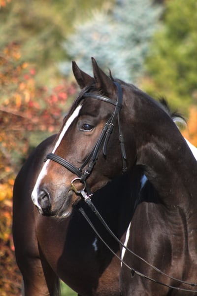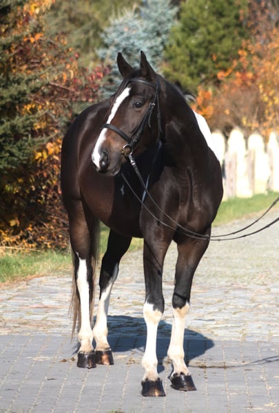 For sale 5-yo piebald lovely gelding. Tall, frame-like, correctly built on strong straight legs and strong deep hooves. Beautifully colored piebald in a chocolate shade. Very calm pro-human character. Brave, easy-going and calm in handling and under saddle. He is not electric or excitable, a wise thinking horse, willing to cooperate with people. Initially broken in last autumn, without rushing or patents. Works in the arena and in the land. Very easy and nice to ride, brave not spooky or electric.. Safe in traffic, dogs, cars etc. Experienced in trails The horse shows jumping predispositions and very good technique. Currently 170 cm Great jumping pedigree from polish angloarab horses: Father Jaśmin: Extremely handsome, correct in build, endowed with very good movement and jumping technique. The horse characterized by good health, balanced temperament is the Vice-Champion tests in 2010, which he passed with a top results. The horse became the Vice-Champion and gold medalist of national championship in 2011. Jaśmin comes from the very distinguished female line of the mare Śmigła, from which such horses as: Jard: IV place at the German Eventing Championships 2022, Jaskinia: II place polish champoship C class 2004, Jamajka: IV place polish championship C class 2008. Grandpa Frazes (Level 150 cm) An Anglo-Arabian stallion bred and own by State Stud. As a young horse, this very good jumper was subjected to sports training both in eventing and show jumping. In 2003, he won the title of Polish Champion of Young Eventing Horses in the four-year-old category. In 2004 he came 12th (out of 66 competing horses) at the Polish Young Horses Jumping Championships in the five-year-old category, making only one mistake during the three days of competition. In 2006 he came 5th at the Polish Championships in jumping in the seven-year-old category. He successfully competed in jumping in the years 2007-2009. Frazes's offspring presented themselves positively at the National Youth Championships of Małopolska(angloarab) Horses in Białka and (older generations) at the Training Plant. Two daughters from the first youth generation by Frazes received a very good mark and took the two top places in the performance tests in 2009. In the same year, Frazes' son, Dionizos, won the stallion performance test at Bogusławice with excellent marks, and a year later Jaśmin came second, also receiving a very good mark. In 2010 Frazes went on a few months' lease to France. Further in the pedigree we have the outstanding stallion Arcus xx (level 160 cm) stallions Sebastian (140 cm) , Paszkwil, Agrest ... A very future horse for sports or leuisure in a beautiful unusual color. Free jumping easily 145 cm , under the rider 80 cm so far due to his young age . Healthy, run, well-groomed, fed with high quality feed, daily on the paddock with a group of friends. Price + 8% VAT We have more nice and quality angloarab horses for sale . Located in 50 km from PL/D border. Transport can be arranged. More on whatsApp + 48 513 179 245