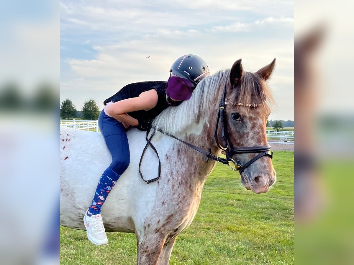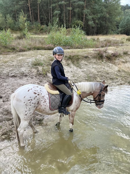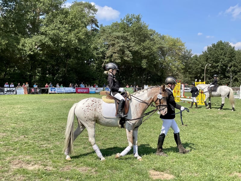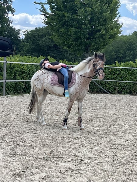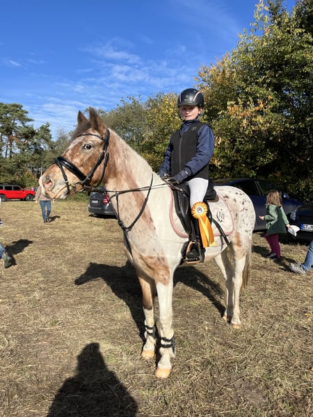 Schweren Herzens verkaufen wir unser 10 jähriges Appaloosa Pony. Sie ist seit 6 Jahren brining und wurde von uns liebevoll ausgebildet. Sie ist ein absoluter Verlasspartner im Alltag und im Gelände. Unerschrocken, brav im Imgang und macht wirklich jeden Quatsch mit. Ob reiten ohne Sattel, Bodenarbeit oder ausgedehnte Ausritte, das ist für unsere Rosi alles kein Problem. Aktuell wird sie regelmäßig von einem 11-jährigen Mädchen geritten und ist auch mit kleineren Kinder anders Longe sehr brav. Sie geht auch 1- und 2-spännig vor der Kutsche. Turnier Erfahrung bringt sie ebenfalls mit. Sie kann etliche Siege und Platzierungen in der Führzügelklasse und im Reiterwettbewerb virweisen. Nur beim Springen kann sie sich im Parcours sehr stark machen und ist deshalb nicht für kleinere Kinder zu empfehlen. Sie ist kein reines Anfängerpony. Dafür hat sie zu viel GO. Sie wird nur in pferdeerfahrene Hände verkauft. Kein Schulbetrieb, keine Händler! Ein echtes Traumpony für Kinder und Freizeit, das mit dem richtigen Reiter einfach alles mit macht und viel Freude bereitet. Wenn alles passt, gegebenenfalls auch zur Verfügung abzugeben Um Reittourismus vorzubeugen, berechne ich 20€ für das Probereiten.