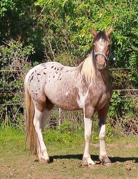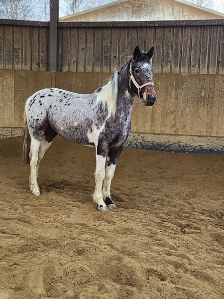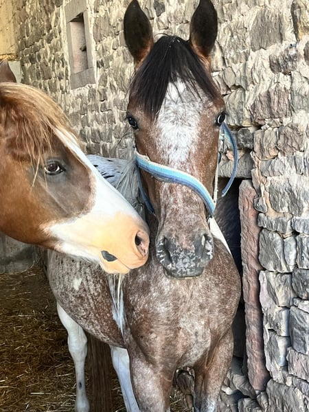Aurora was born in May 2021. She was backed at four years old, which went well without any bucking. She is familiar with lungeing, dual lanes, and small jumps. Once she learns something new, she picks it up immediately. She is always eager to learn new things and be developed. Going for walks outside is not a problem. She has only been out on a ride twice so far and has gone with a companion horse. Equine passport with vaccination, see pictures. She is currently 1.50 m tall and may still grow a few centimeters. Her unique color and markings speak for themselves.