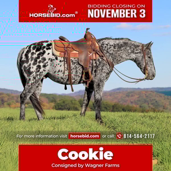 ⚜️𝐓𝐇𝐄 𝐅𝐀𝐋𝐋 𝐇𝐄𝐑𝐈𝐓𝐀𝐆𝐄 𝐂𝐋𝐀𝐒𝐒𝐈𝐂⚜️ Happening now thru MONDAY | NOVEMBER 3rd - Available EXCLUSIVELY on HorseBid's website! For more details and to register visit: www.Horsebid.com CONSIGNOR CONTACT: Wagner Farms 814-564-2117 LOCATION: Clarion, PA BREED: Appaloosa REGISTERED: No COLOR: Leopard HEIGHT: 14.3 AGE: 10 GENDER: Gelding Cookie is an extra flashy loud colored, super gentle, versatile and well trained BLACK AND WHITE LEOPARD APPALOOSA GELDING that the whole family can ride. This gelding has been shown Western and English successfully . Cookie has been ridden by beginners, youth and novice riders. Honestly if you cant ride Cookie you might want to find another hobby he is that quiet and gentle. I have had kids ride him all over. He is a baby sitter deluxe. He is a great trail horse that walks relaxed all day on a nice loose rein. Goes over the logs, thru the mud and thru the creeks with ease on the trail . If i want to go on a nice relaxing Sunday afternoon trail ride he would definitely be my pick. He is well trained with a nice one hand neck rein, good stop and smooth trot and lope. I have let him sit a week or two without being ridden and he will ride off quiet and low headed like he was rode the day before each and every time. Super friendly and gentle to handle on the ground. He would make a first time horse owner a good first horse to own because hes so quiet and gentle but he is also well trained and broke enough a experienced horseman can take him out and have fun on him. Cookie just recently has a health and lameness exam done by a vet and passed with flying colors. Call or Text Glory at Wagner Farms at 814-564-2117. Thank You and God Bless