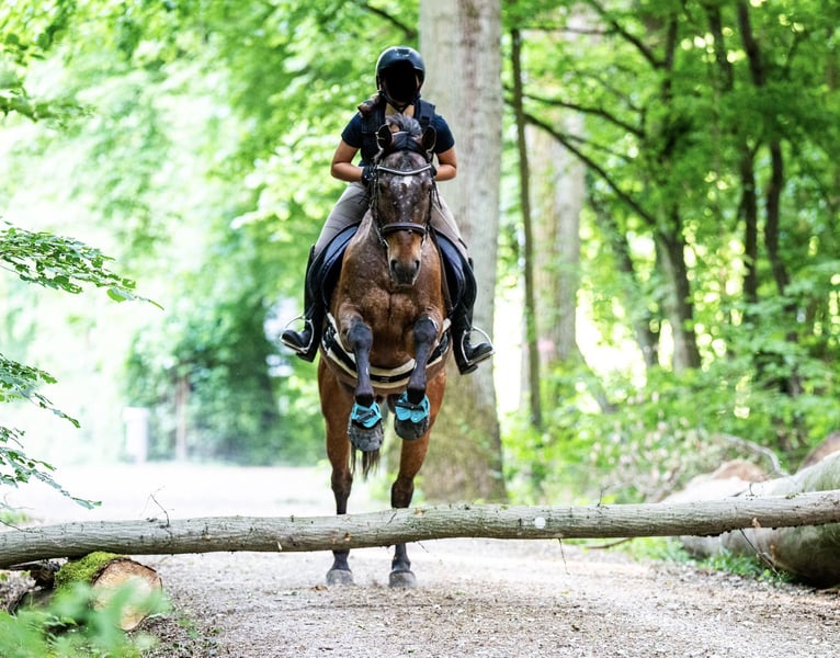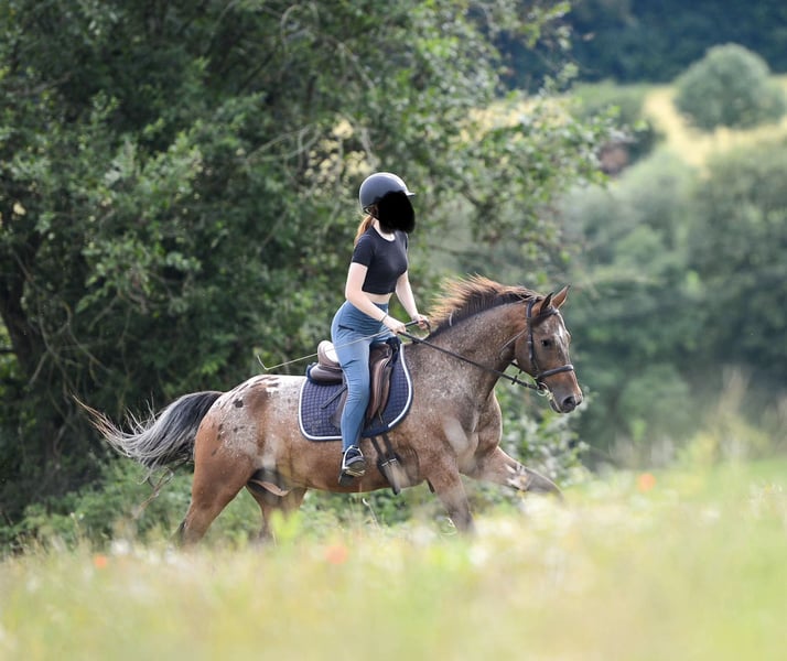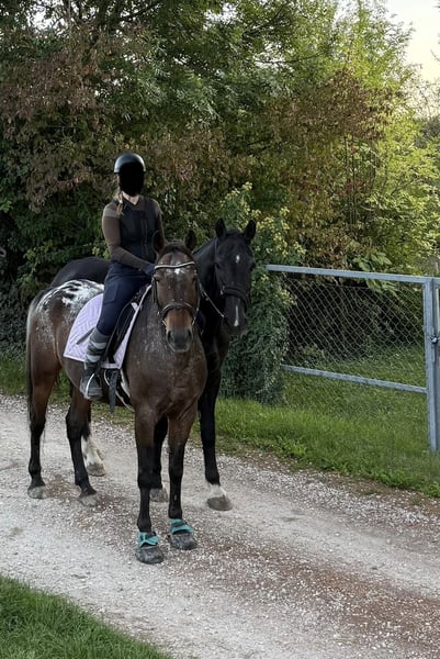 Spirit to 13-year-old Appaloosa-Arabian mix. He is 16.1 hands tall and well-built. Spirit is a clever gelding who loves activity in all forms. He enjoys trail riding, approaching boldly, but can also be ridden from behind or in the middle. Spirit has a lot of energy and needs to be exercised and challenged daily. In dressage, he is at A/L level. Lateral movements in walk and trot are available upon request. When given correct aids, he can move beautifully in a collected frame and presents a very elegant appearance. Spirit is also familiar with pole work and jumping, often taking small obstacles confidently and, of course, performing at his best over higher jumps. For experienced jumpers, he is a joy to ride, as he has the willingness to clear the fences. He is a horse that adapts very well to the rider's energy and can be ridden accordingly. He prefers to be guided and framed by rider aids. We purchased Spirit privately three years ago for our riding school. He has no issues with changing riders or different riding levels. We often use him in dressage lessons and for trail rides. Even beginners, who ride in pairs at a walk, find him very well-behaved and eager to please. For gallop and jumping beginners, he is unfortunately too energetic and enthusiastic. That is why we are now looking for a more suitable home for him. Our riding operation has been shifting towards beginner instruction since this year, and we notice that Spirit is underchallenged and has much more potential than we need. Therefore, we want to give him the chance to find a person who can challenge and develop him while he is still young. Spirit is kept with us in a mixed herd and is very compatible with all horses. He is playful and friendly, making friends with everyone without being dominant. We feed Spirit with haylage, as he tends to cough with our hay. The previous owners did not have any issues with coughing. In summer, Spirit wears a mask permanently due to his sensitive Appaloosa eyes, which helps protect him from UV rays. In spring, autumn, and winter, he does not wear a mask. We can still imagine Spirit in a horse-friendly riding school with proper, species-appropriate care. Since we are advocates of riding without auxiliary bits, we would only consider riding schools that share this philosophy. We see Spirit fitting very well into advanced, gallop-secure lessons, both in dressage and jumping. Further information and photos of our riding club can be found at www.reitclub-kronberg.de We are also on Instagram: https://www.instagram.com/reitclub.kronberg?utm_source=ig_web_button_share_sheet&igsh=ZDNlZDc0MzIxNw==