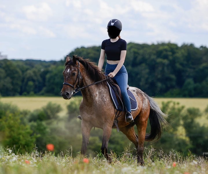 Spirit is a 13-year-old Appaloosa-Arabian cross. He is 1.60 meters tall and has a solid build. Spirit is a clever little horse who loves all kinds of activity. He enjoys hacking out, approaching it confidently, but can also be ridden from behind or in the middle of the herd. Spirit has a lot of energy and needs daily movement and mental stimulation. In dressage, he is at A/L level. Lateral movements in walk and trot are available on command. When given correct aids, he can move beautifully in a frame and presents a very elegant appearance. Spirit is also familiar with pole work and jumping, often taking small obstacles higher and, of course, rising to the occasion at larger jumps. For experienced jumpers, he is a joy to ride because he is eager to clear the fences. Spirit is a horse that adapts very well to the rider’s energy and can be ridden accordingly. He prefers to be guided and supported by rider aids. We bought Spirit privately three years ago for our riding school. He has no issues with changing riders or varying riding levels. We often use him in dressage lessons and for hacks. Even beginners, who ride in pairs at walk, find him very well-behaved and willing. For gallop and jumping beginners, he is unfortunately too eager and enthusiastic. That’s why we have decided to find him a more suitable home. Our riding school has been shifting towards beginner lessons this year, and we notice that Spirit is underchallenged and has much more potential than we currently need. Therefore, we want to give him the chance, while he is still young, to find someone who can challenge and develop him. Spirit is part of a mixed herd with us and gets along well with everyone. He is very playful and friendly, making friends easily without being dominant. We feed Spirit haylage because he tends to cough with our hay. The previous owners had no issues with coughing. In summer, Spirit wears a mask permanently due to his sensitive Appaloosa eyes, which helps protect him against UV rays. He does not wear a mask in spring, autumn, or winter. We can still imagine Spirit in a horse-friendly riding school with proper husbandry. As supporters of riding without auxiliary bits, we would only consider a riding school that shares this philosophy. We see him fitting well into advanced, gallop-stable lessons, both in dressage and jumping. Further information and photos of our riding club can be found at www.reitclub-kronberg.de You can also find us on Instagram: https://www.instagram.com/reitclub.kronberg?utm_source=ig_web_button_share_sheet&igsh=ZDNlZDc0MzIxNw==