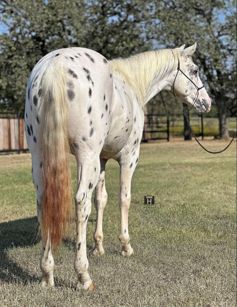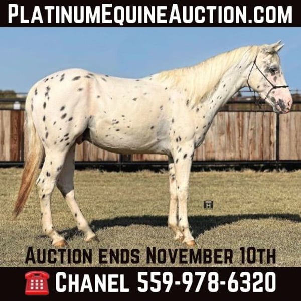 ONLINE AUCTION Place your bids at www.PlatinumEquineAuction.com Starting Bid $3500 Auction ends November 10th, 2024 Need a new saddle? Check out White Rock Saddles on our website or Facebook! Flashy meets Personality. Meet Cowtown – a 2021 Appaloosa gelding standing 15 hands tall. Cowtown is the sweetest horse you will ever meet with tons of personality and the gentlest demeanor you could ask for. He is one of the most willing and good natured young horses we have ever had the pleasure of owning. Cowtown is started right and going well. He rides outside, over the obstacles, down the trails, out on the ranch and gathers the cows like a champ. He is independent and confident and will have fun doing any task you ask him to do. He is smooth and easy to ride. He saddles up like a gentleman every ride and is the first to meet you at the gate ready to get any type of attention he can get. Cowtown is playful and loves the balls, tarps, bags, blankets, you name it he will play with it. He is well mannered, hauls, stalls, pastures, bathes, etc. He learns quickly and remembers what you teach him. Cowtown has one of the best minds and could go any direction! He is sound and straight/clean legged. FMI call/text Holland Horse Co. Chanel 559-978-6320 for more information. Located in Jacksboro, TX. We are happy to answer questions and help arrange shipping nationwide. ONLINE AUCTION Place your bids at www.PlatinumEquineAuction.com Starting Bid $3500 Auction ends November 10th, 2024 Need a new saddle? Check out White Rock Saddles on our website or Facebook!