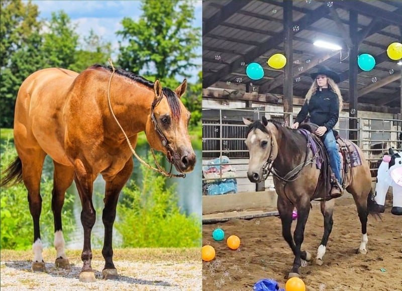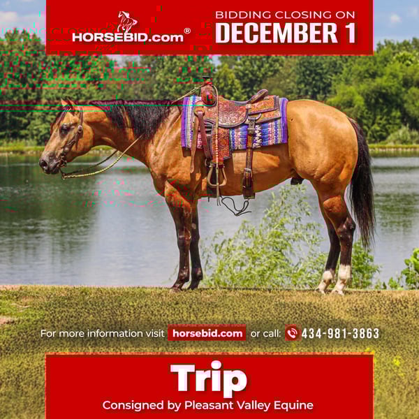 ⚜️ 𝓽𝓱𝓮 𝐇𝐨𝐫𝐬𝐞𝐦𝐚𝐧'𝐬 𝓢𝓱𝓸𝔀𝓬𝓪𝓼𝓮⚜️ Happening now thru MONDAY | DECEMBER 1st - Available EXCLUSIVELY on HorseBid's website! For more details and to register visit: www.Horsebid.com CONSIGNOR CONTACT: Pleasant Valley Equine 434-981-3863 LOCATION: Robards, KY BREED: Appaloosa Horse Club, Buckskin Association REGISTERED: Yes REGISTERED NAME: Collecting The Secretz COLOR: Buckskin HEIGHT: 15.3 AGE: 4 GENDER: Gelding What a handsome boy Collecting The Secretz is. You will not find another one built like him. He truly is breathtaking to be around. "Trip" has a presence about him; you will be in awe. He is the perfect buckskin color and has MULTIPLE WORLD CHAMPIONSHIPS & top 3 placements on his resume. He is registered 3 ways: Appaloosa Horse Club, American Buckskin Registry, International Buckskin Association, and he has his National Snaffle Bit Association certificate. Trip has been hauled and stayed overnight at 3- to 5-day shows and was shown by an amateur. The sky's the limit with Trip; finish him out and take him to the performance ring, or have an absolutely stunning horse to hit the trails with. Trip LOVES all the trail obstacles and desensitizing toys: the pools, noodles, tarps, and flags. He is no stranger to a side-by-side or 4-wheeler. His show career has taught him to be patient, confident, consistent, and brave. Trip has the best demeanor and enjoys a good bath, loves to be curried, and will stand for hours to be pampered. He is good for the farrier, loading, hauling, and easy to clip. Trip is a 4-year-old, standing 15.3 hands and weighs 1300 lbs. He is clean-legged and big-boned with nice big hoofs. Trip has been well taken care of and is looking for the next person to continue his career. Call today for more information or to visit Trip 434-981-3863