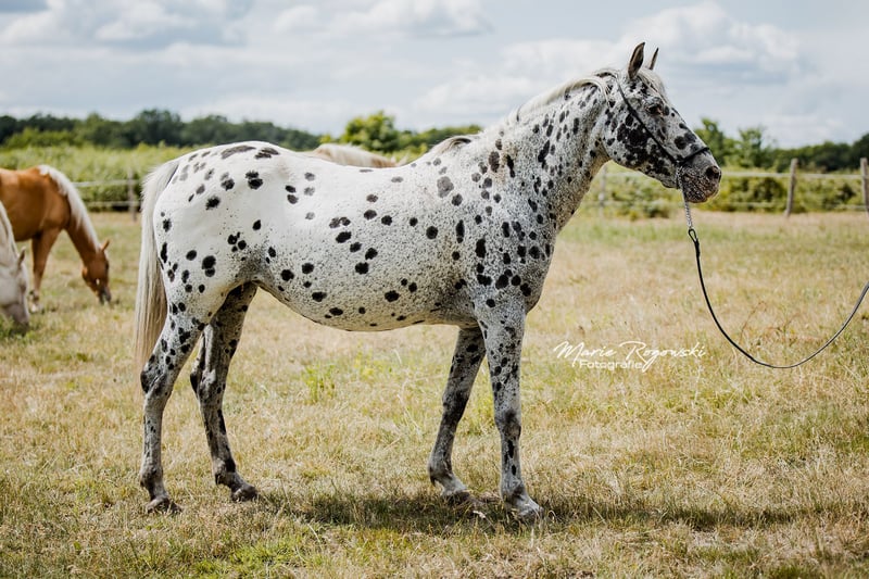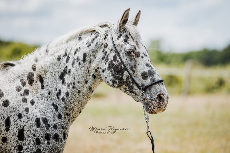 Jument arabesque (ZfdP Spezialpferde) | *2012 | Black Leopard (pie tigrée) | 150 cm ABRAKADABRA GF est une jument arabesque correctement bâtie, au pelage remarquable, à la silhouette athlétique et aux membres solides. Elle n'a jamais été montée et n'est actuellement pas dressée, mais elle est habituée à la vie quotidienne au haras. Ses mouvements sont légers et rythmés. Son père, Attila vom Wethautal, était un étalon primé à l'apparence remarquable, doté d'une très bonne mécanique des antérieurs et d'un caractère charmant. Il a été sacré vainqueur de l'approbation et a réussi le test de performance des étalons malgré une formation tardive. Sa descendance a convaincu à maintes reprises par son type, sa correction et ses allures. La mère Messina ox apporte du sang arabe pur dans la lignée et confère à Abrakadabra une élégance et une expression supplémentaires. Abrakadabra est adapté à l'élevage ou à une future carrière dans les loisirs.