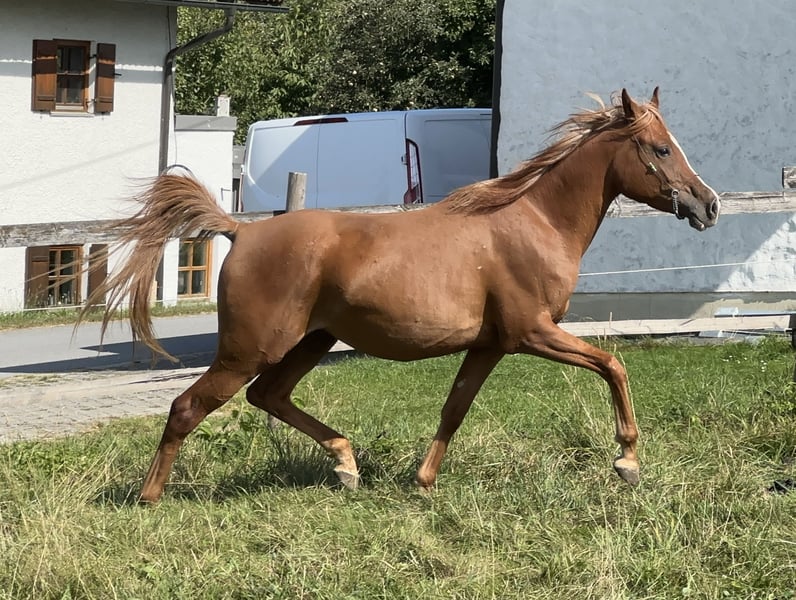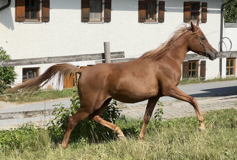 Leyana AB ist ein ganggewaltiges Partbred Stütchen mit bezaubernden Charakter. Und herausragender Nervenstärke. Ihr Vollblutaraberanteil liegt bei 75%. Mutter Lateefa AB ist auch aus unserer Zucht und Prämienstute. Sie ist mehrfach A Dressur mit mir platziert. Lilly Marlen, Holsteiner, Lateefa ABs Mutter, ebenfalls aus meiner Zucht, wurde von mir Springpferde L siegreich geritten. Ihr Vater Lamborghini Boy war ebenfalls in meinem Besitz und bis springen M erfolgreich und S Dressur. Lilly Marlens Mutter Escarda war S springen platziert und doppelte Hengstmutter. Der Vater von Leyana AB, der Vollblutaraberhengst Al Ilaf Thamin, ist mit der Note 8 leistungsgeprüft auf Station und hat auch eine sehr gute Fahrveranlagungsprüfung absolviert. Der Muttervater der Vollblutaraber Hengst FM Shah Nasaa war gekört in D und AUT und doppelt leistungsgeprüft. Mit mir im Distanzsport und auf Station. Sein Vater Nashki war ebenfalls leistungsgeprüft. Leyana AB wächst extensiv im Herdenverband bei uns im Offenstall auf. Durch die verschiedenen Untergründe haben alle unsere Pferde extrem gute Hufe. Im Sommer laufen die Pferde auf 24/7 Wiese hier im niederbayerischen Hügelland. Unsere Pferde sind dadurch sehr gut ausbalanciert, gesund und abgehärtet, Hier geht es zu unserer Web Seite: www.bavaria-pferdesport.de