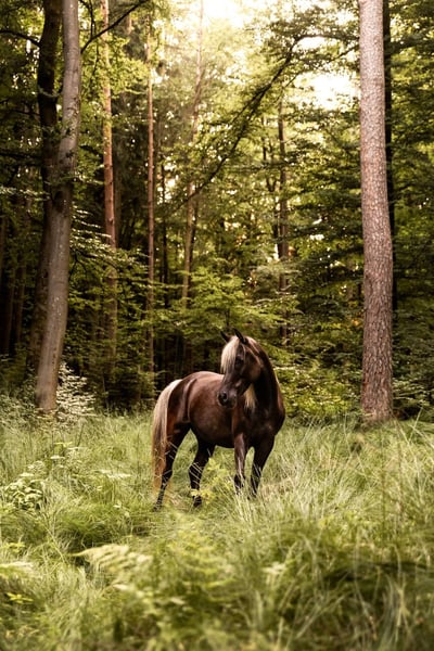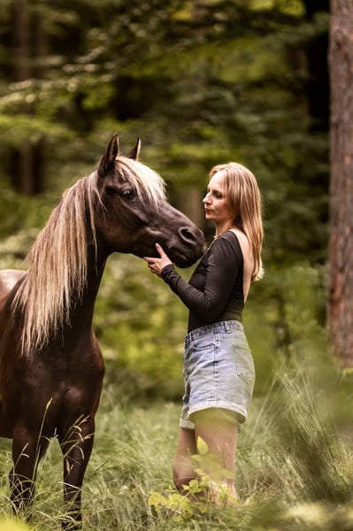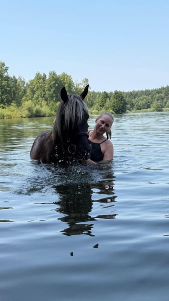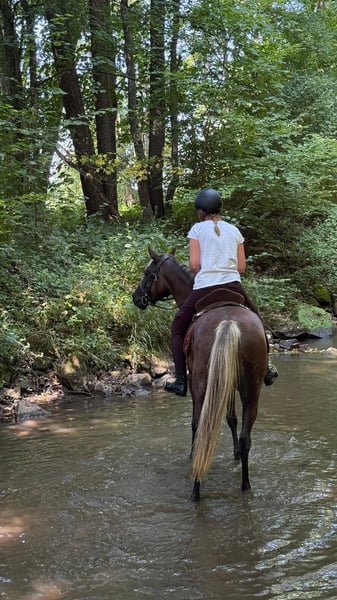 Aus gesundheitlichen Gründen habe ich mich dazu entschlossen meinen Araber Shamal aus der Zucht von Pam Cellini abzugeben. Zu den Eckdaten: Silverblossom Shamal, geb. 2017, Wallach Partbredaraber in der äußerst seltenen und wunderschönen Farbe Black Silverdapple (oder auch Windfarben auf deutsch). Vater: EA Bayao Mutter: Savannah Silber Doll Stockmaß: 1,45m Ich habe Shamal mit 1,5 Jahren direkt von der Züchterin gekauft und ihn mit 3 Jahren aufs Einreiten vorbereitet und mit ca. 4 Jahren eingeritten. Er wurde in klassischer Dressur ausgebildet, läuft alle Seitengänge in Schritt und Trab und ein wahrgewordener Traum beim Reiten. Er steht so fein an den Hilfen, lässt sich ausschließlich mit Gewichtshilfen reiten und macht einfach nur Freude. Womit er sich exterieurbedingt noch ein bisschen schwerer tut ist der Galopp in der Reitbahn. Er geloppiert, aber arabertypisch ist er sehr stackselig im Galopp. Außerdem hat er auch sehr viel Freude am Ausreiten, er wird sicher auch als reines Geländepferd glücklich und kann auch über lange Zeit und mit wenig Puls-Aufwand einen guten Distanztrab auspacken. Genauso wie man ihn fördern kann, kann man ihn aber auch entspannt und gechillt reiten. Solange die Haltungsbedingungen stimmen und er viel draußen ist, kann man ihn getrost auch mal zwei Wochen stehen lassen und dann nur einen Schritt Ausritt machen, ohne dass er blöd wird. Darüberhinaus kennt er klassische Handarbeit, Freiarbeit, Bodenarbeit, Doppellonge, Handpferdereiten, Spazieren gehen. Er ist bei mir sowohl im Offenstall, als auch nachts in der Box und tagsüber draussen gewesen und sowohl in reinen Wallach Gruppen, als auch in gemischten Gruppen. Shamal ist ein absolut unkompliziertes Pferd und hat auch gesundheitlich keine Einschränkungen. Er hat keine Unarten oder schlechten Angewohnheiten, das höchste der Gefühle ist, dass er mal flott wird, aber er ist mir bis heute noch nie durchgegangen. Er war mit mir auf Dressurlehrgängen, Orientierungstitten, Ausreitausflügen, im See baden uvm. Rassebedingt muss man sich anfangs erst einmal beweisen, sonst versucht er schon herauszufinden, ob man alles so machen muss, wie der Mensch es sagt, aber wenn man ein Team mit ihm geworden ist, dann würde er für seinen Menschen alles machen. Er steht in 91220 Schnaittach.