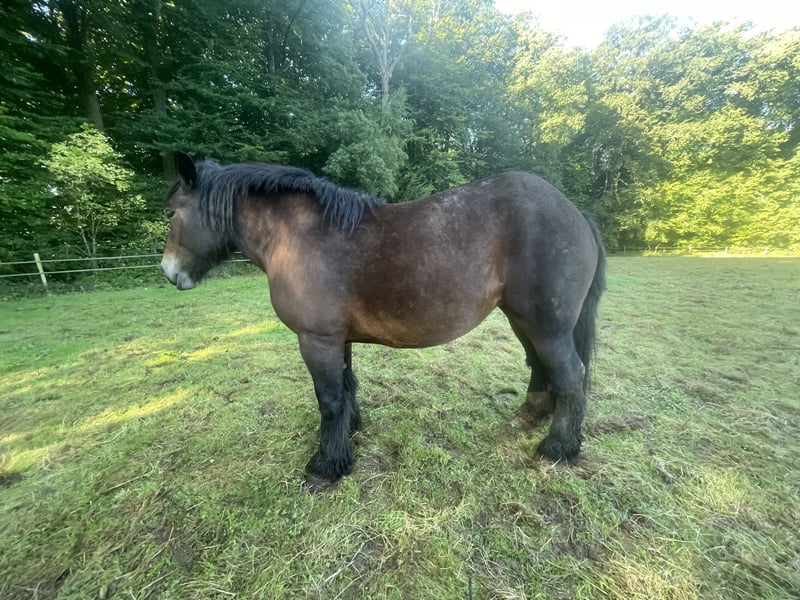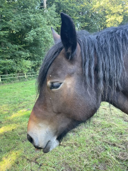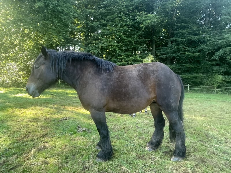 Bagira is a 5-year-old Ardennes mare, microchipped, registered in the Luxembourg Ardennes studbook. She is regularly dewormed, familiar with trailer loading and the farrier, and is very affectionate and calm. She is accustomed to cars, sirens, and her environment from walks, although she has not yet been trained under saddle.