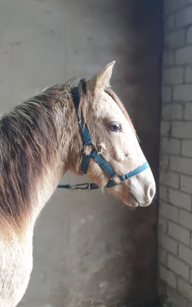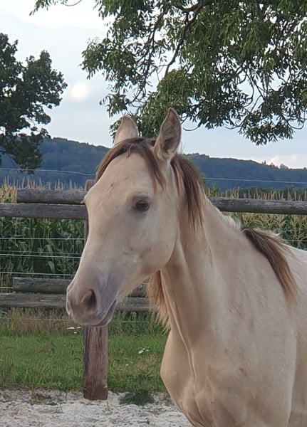One-year-old Azteca stallion in the special color Amber Champagne Dun for sale. This one-year-old Azteca stallion is a true eye-catcher, not only because of his pedigree (Lusitano x Paint Horse) but also due to his rare special color Amber Champagne Dun. His golden shimmering coat makes him a unique specimen. But he is more than just beautiful: he is an alert, friendly, and curious young horse who impresses with his excellent basic gaits and a lovely natural balance. These qualities make him an ideal candidate for Working Equitation, as well as for Western riding and as a versatile leisure partner. He is healthy, well-socialized, and ready to be developed by you. Key data: Breed: Azteca (Lusitano x American Paint Horse) Age: 1 year Gender: Stallion Color: Amber Champagne Dun Potential: Working Equitation, Western, leisure Expected height: approx. 1.57 m He could also remain for further upbringing and will only be sold to a suitable home.